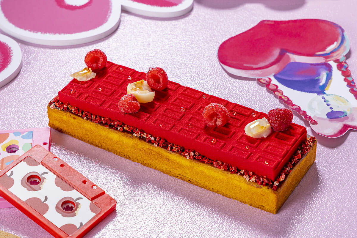 ライチ香るタルト生地の上に、板チョコのフォルムのフランボワーズ&ダークチョコレートのガナッシュを乗せた「あの日渡せなかったチョコレート」、