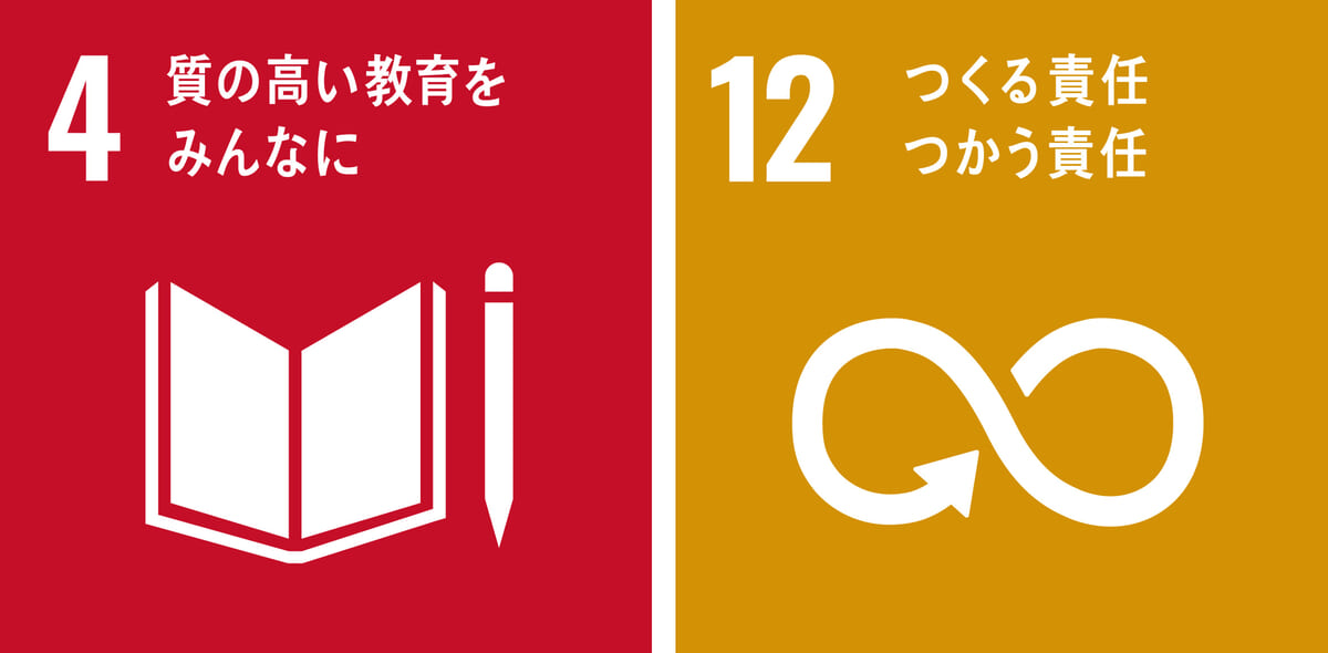 「キッズフリマ」の取り組みは、SDGsにおける目標4「質の高い教育をみんなに」と目標12「つくる責任、使う責任」の、2つの目標達成に貢献しています。