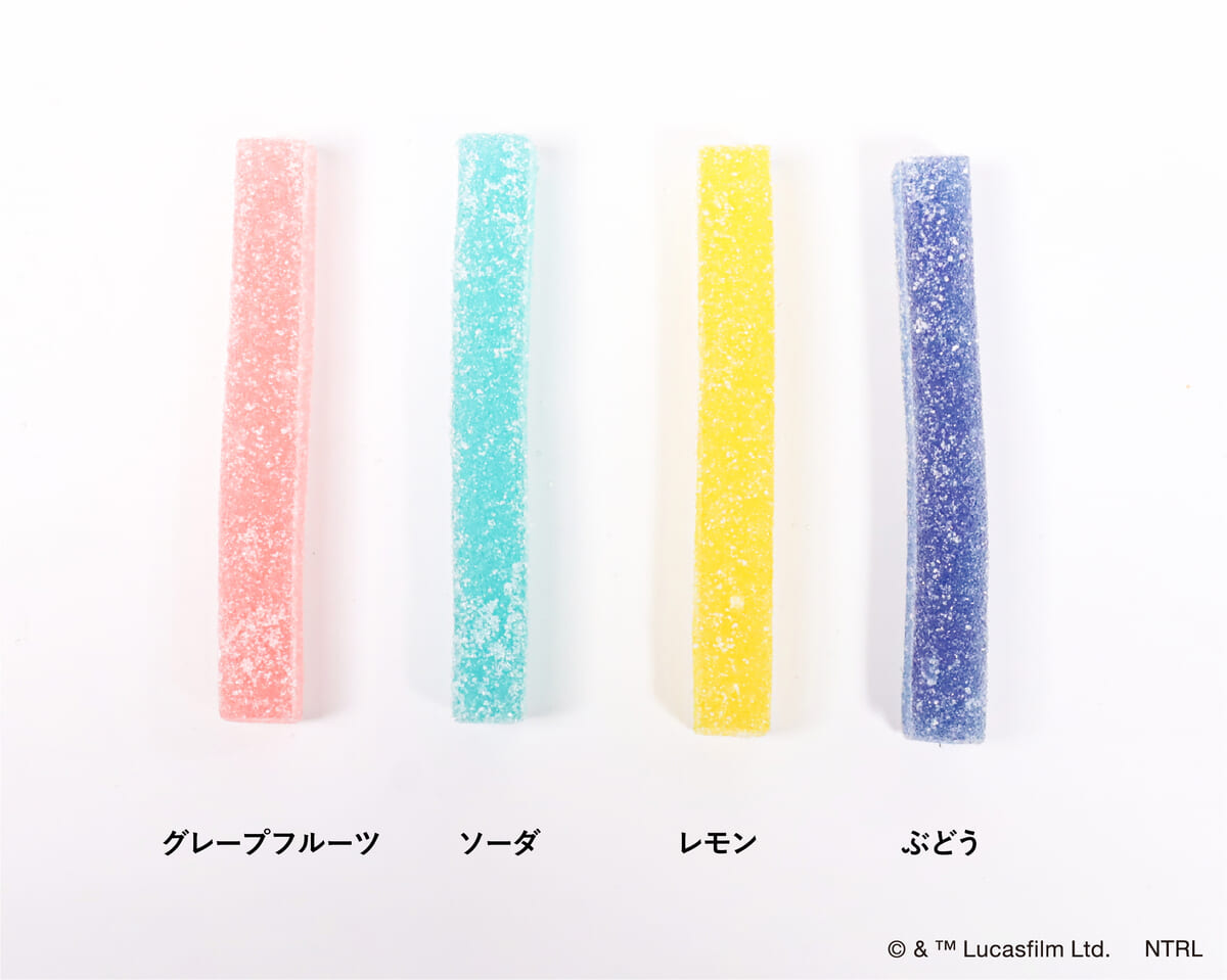 ライトセーバーのイラストがデザインされたパッケージの中には、ライトセーバーの光をイメージした4色のグミがアソートされます。