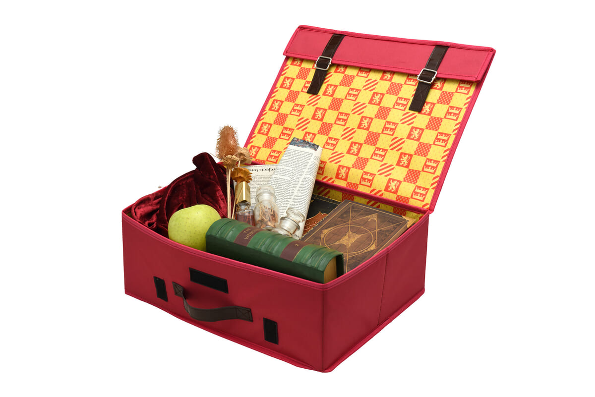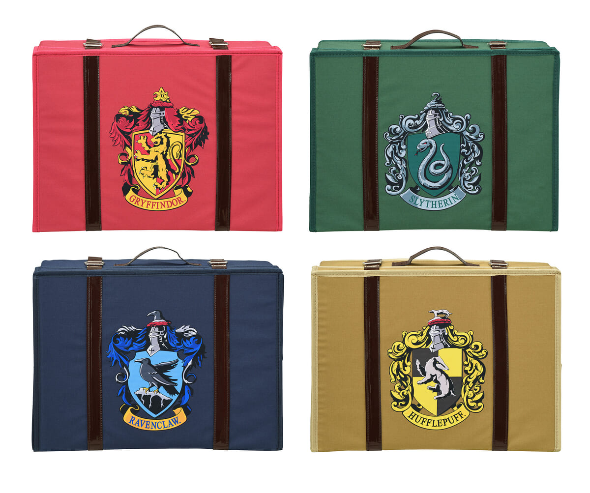 『ハリー・ポッター』のホグワーツ4寮の寮章をあしらったトランク型収納ボックス。