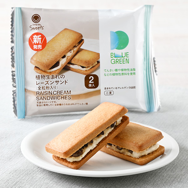 小麦全粒粉入りの生地と、ラム漬けのレーズンを入れたクリームを合わせた「植物生まれのレーズンサンド」