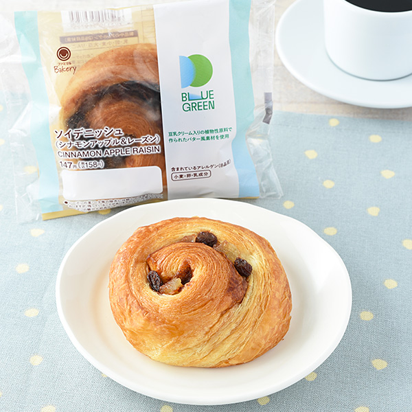 豆乳クリーム入りの植物性原料で作られたバター風素材を折り込んだデニッシュに、シナモン香るリンゴとレーズンを巻き込んで焼き上げています。