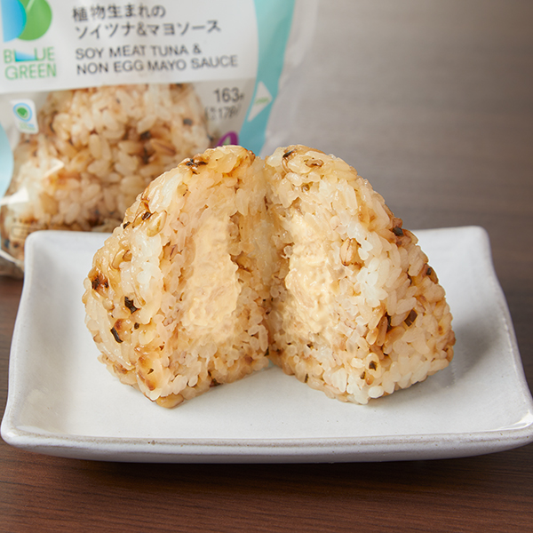 塩こんぶを混ぜたスーパー大麦入りのごはんで、大豆ミートと卵不使用のマヨソースを包んだ植物生まれの食材をメインにしたおむすびです。
