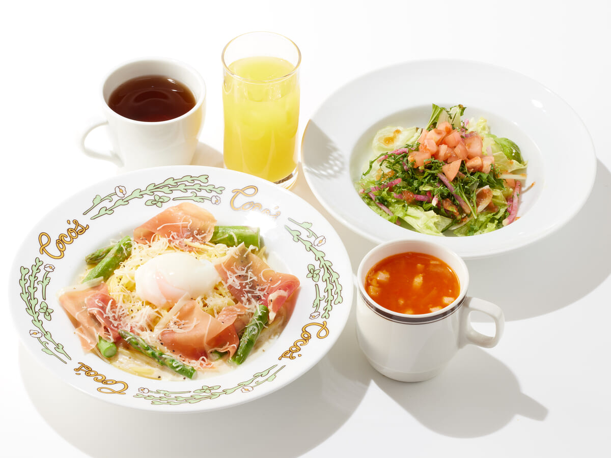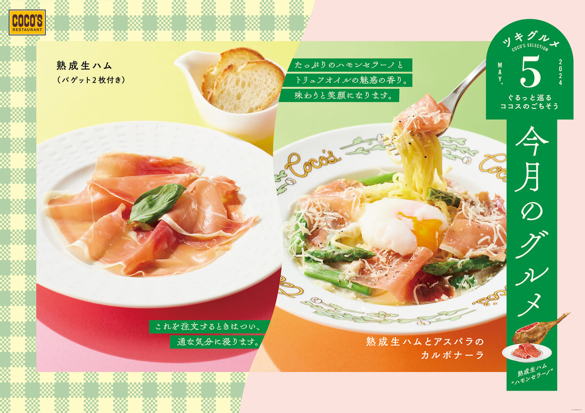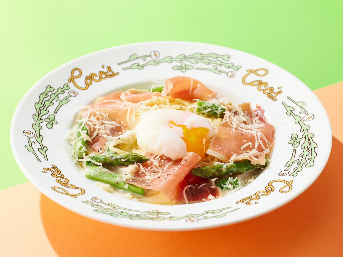 ファミリーレストラン「ココス」にて、2024年5月1日(水)より熟成生ハム“ハモンセラーノ”と旬のアスパラを楽しめる「今月のグルメ~5月~」の提供がスタート!