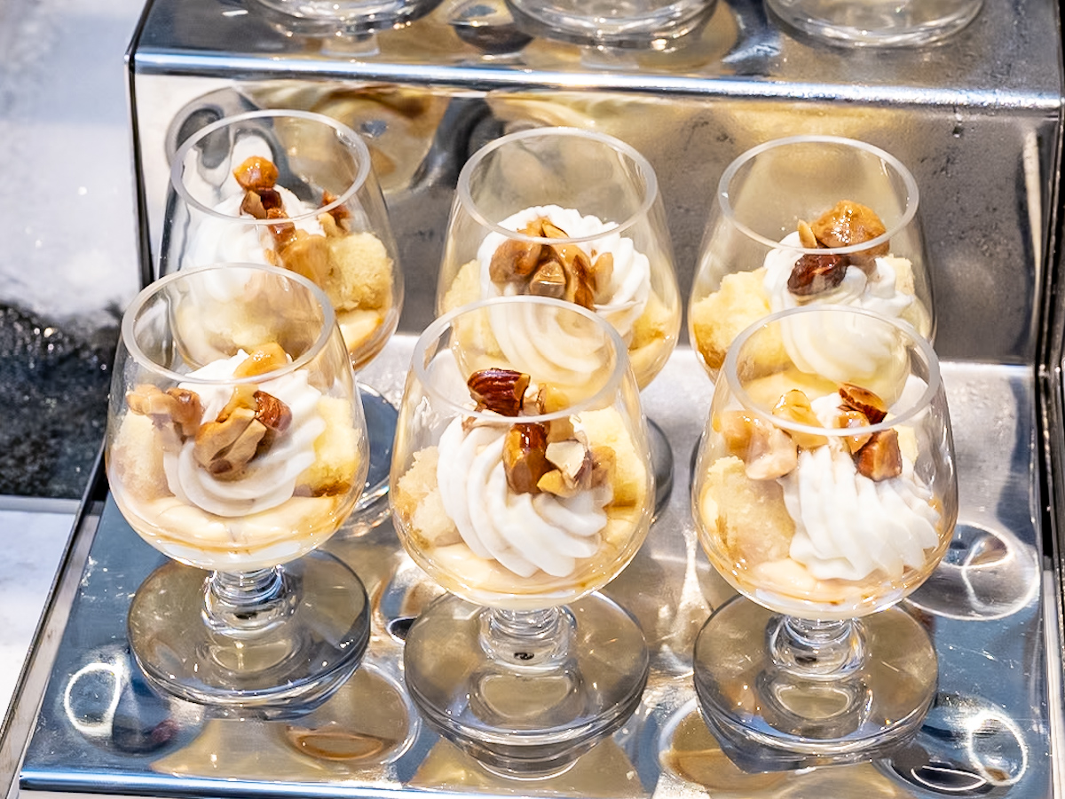 カスタードクリーム、スポンジ生地、はちみつで絡めたナッツをプチグラスの中に重ねたデザートです。