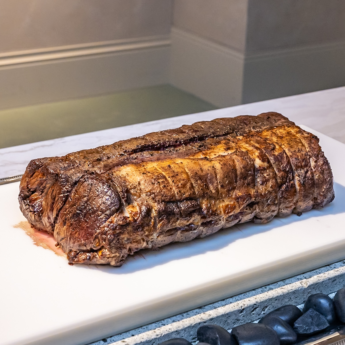 ビーフのショートロインの表面を香ばしく焼き上げた後に、低温のオーブンでゆっくりとロースト。