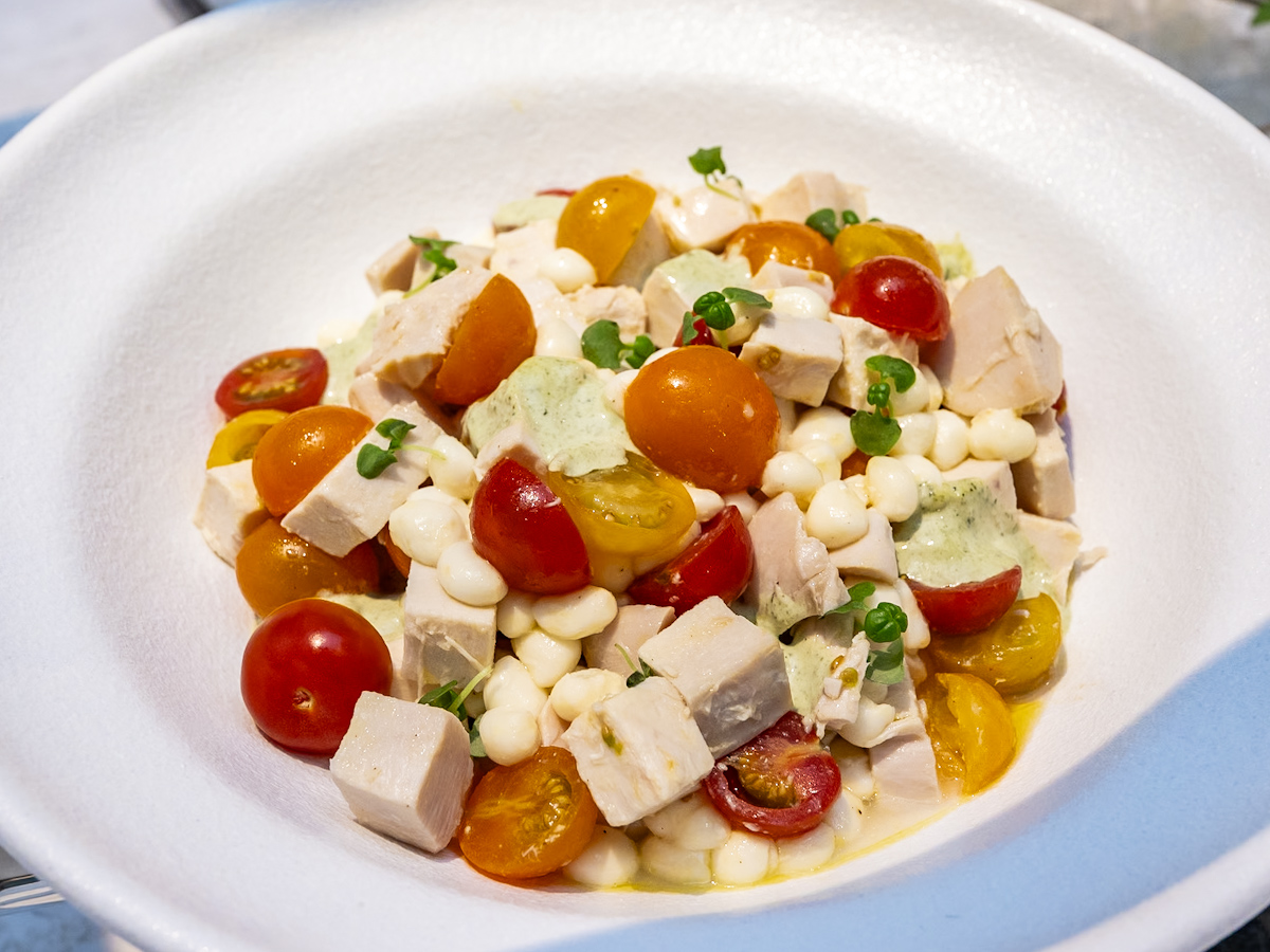 塩とバジルでマリネし、低温で火入れした鶏むね肉にモッツァレラ、ミニトマトを合わせた爽やかなサラダです。