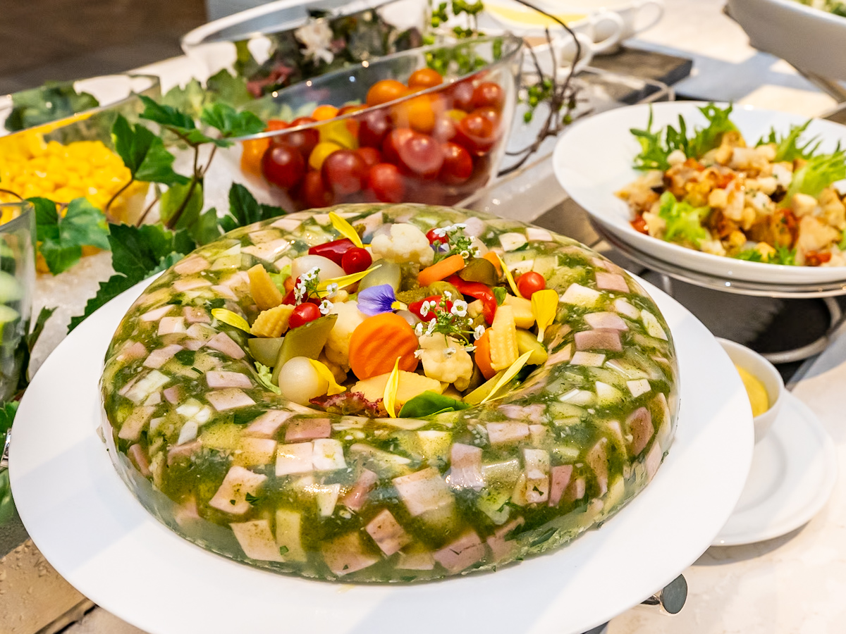 ハムとやわらかく煮込んだ豚足を、パセリ、タラゴンと共に煮汁でゼリー寄せにした料理です。