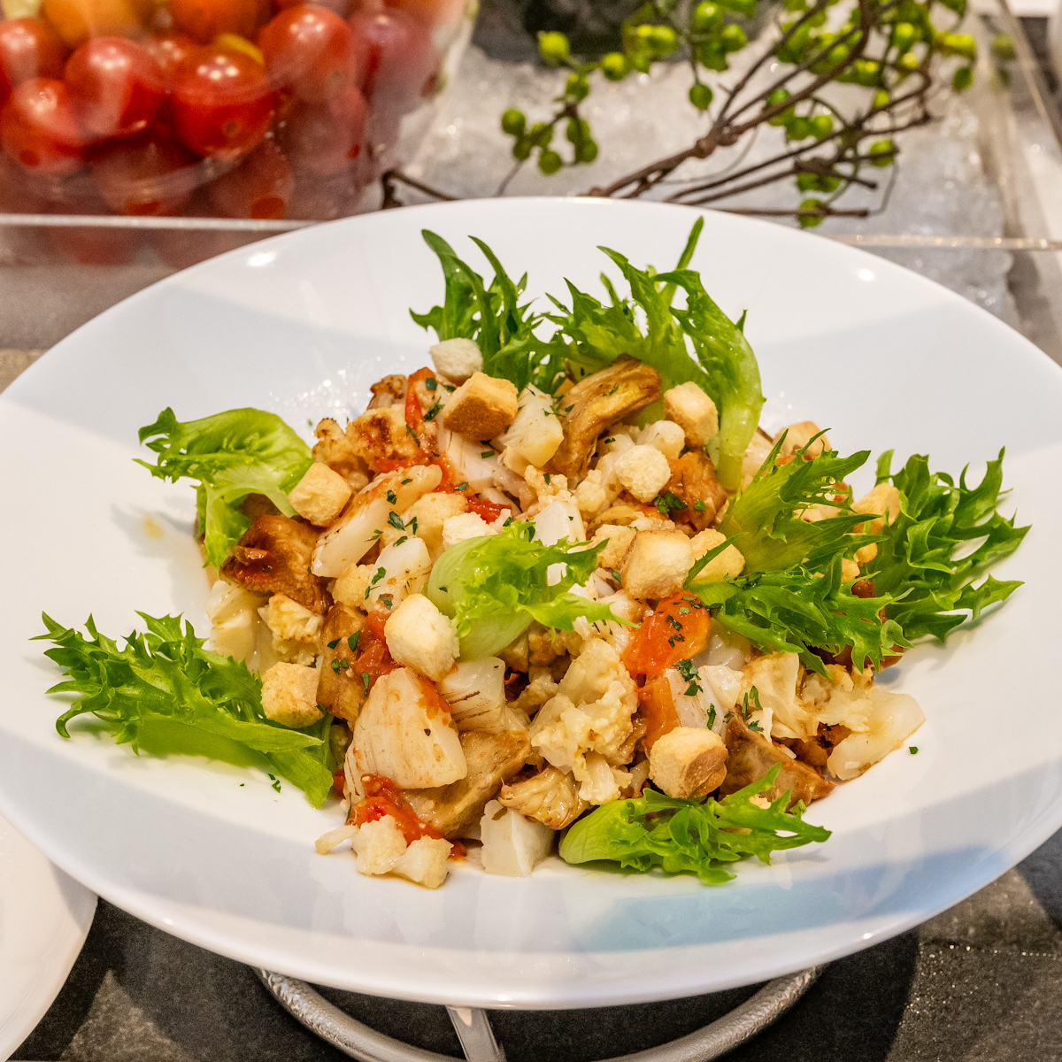 香ばしく焼き色をつけたイカとアーティチョーク、カリフラワーをガーリックの香るドレッシングで味付けしてあります。