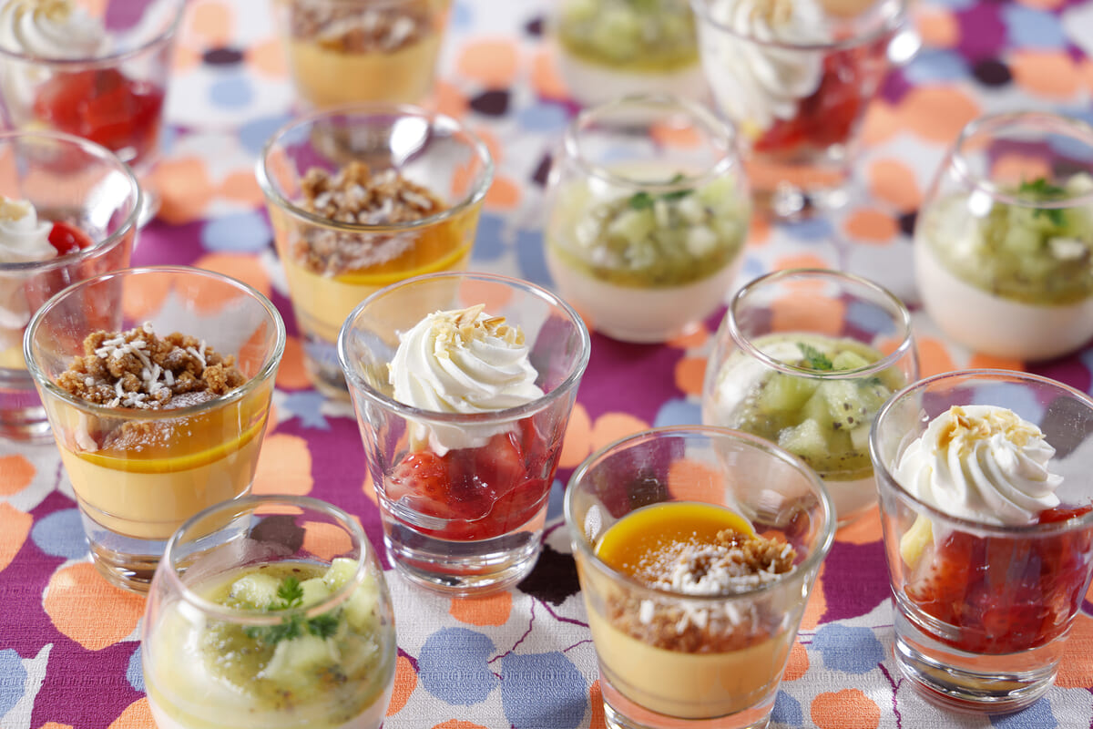 グラスデザート 3種(マンゴープリンとココナッツクランブル/ショートケーキ/レアチーズムースとキウイフルーツ)の他、