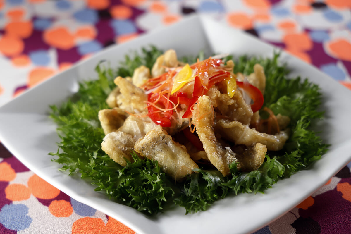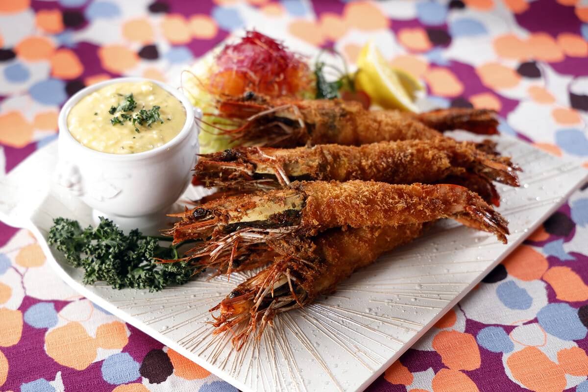 「有頭エビフライ」や「シンガポールチキンライス」、ディナータイムには「握り寿司」、「国産牛のロースト」などライブキッチンから届く出来立ての料理が楽しめます。