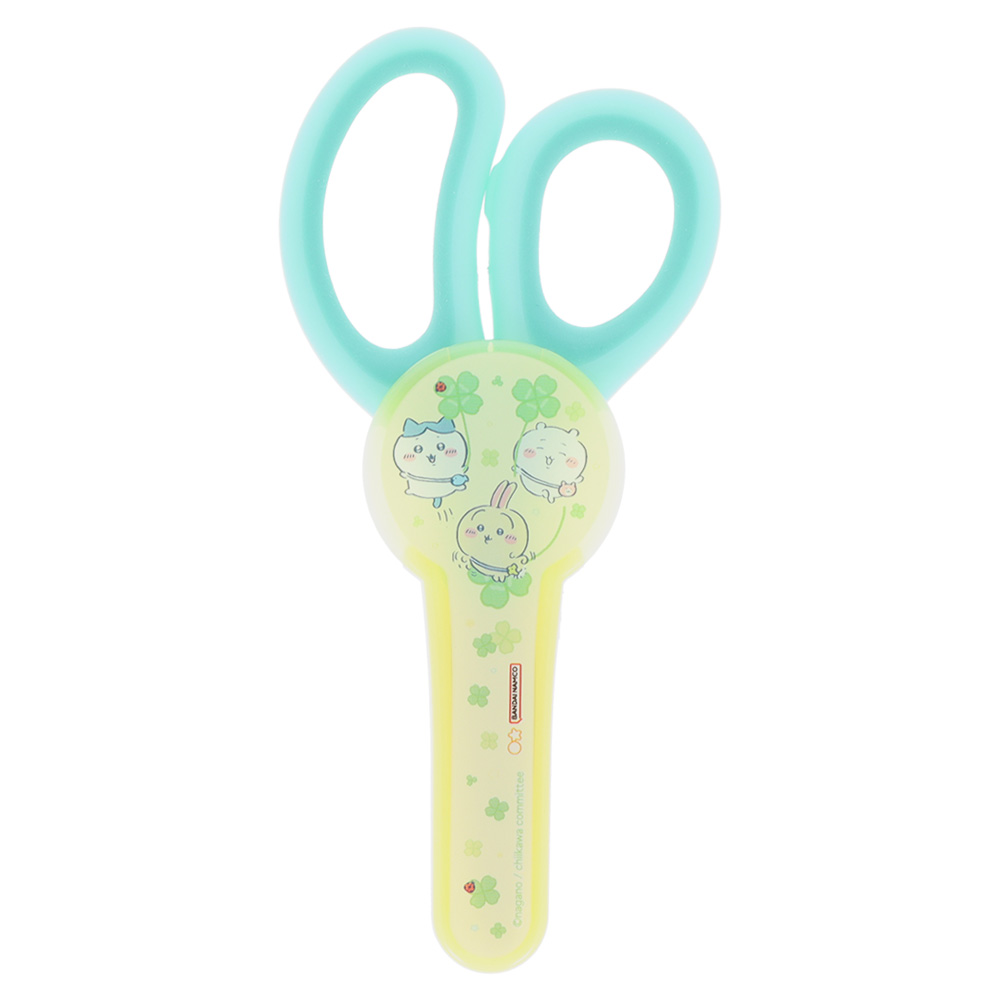 爽やかなブルーの持ち手のハサミに、イエローのキャップ、そしてネームタグがセットになっています。