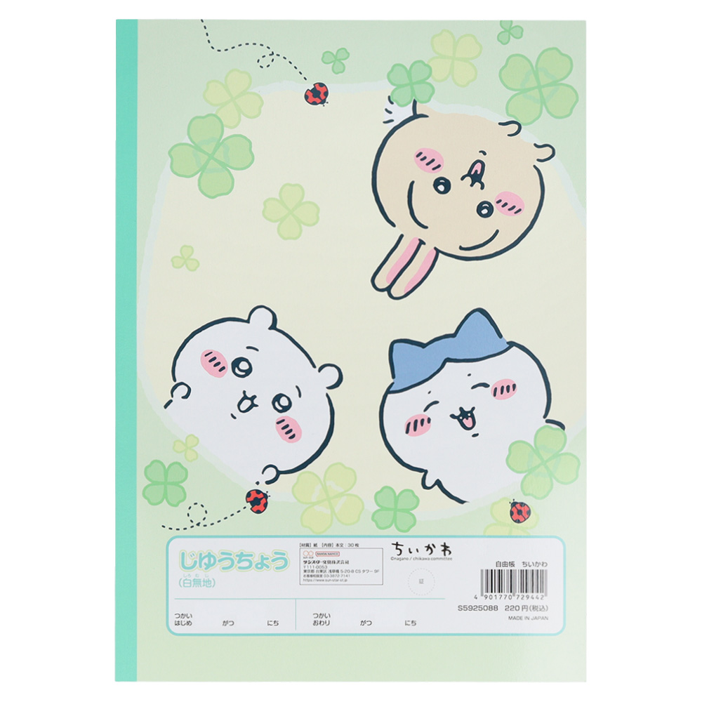 楽しそうな「ちいかわ」「ハチワレ」「うさぎ」が表紙に描かれた自由帳です!