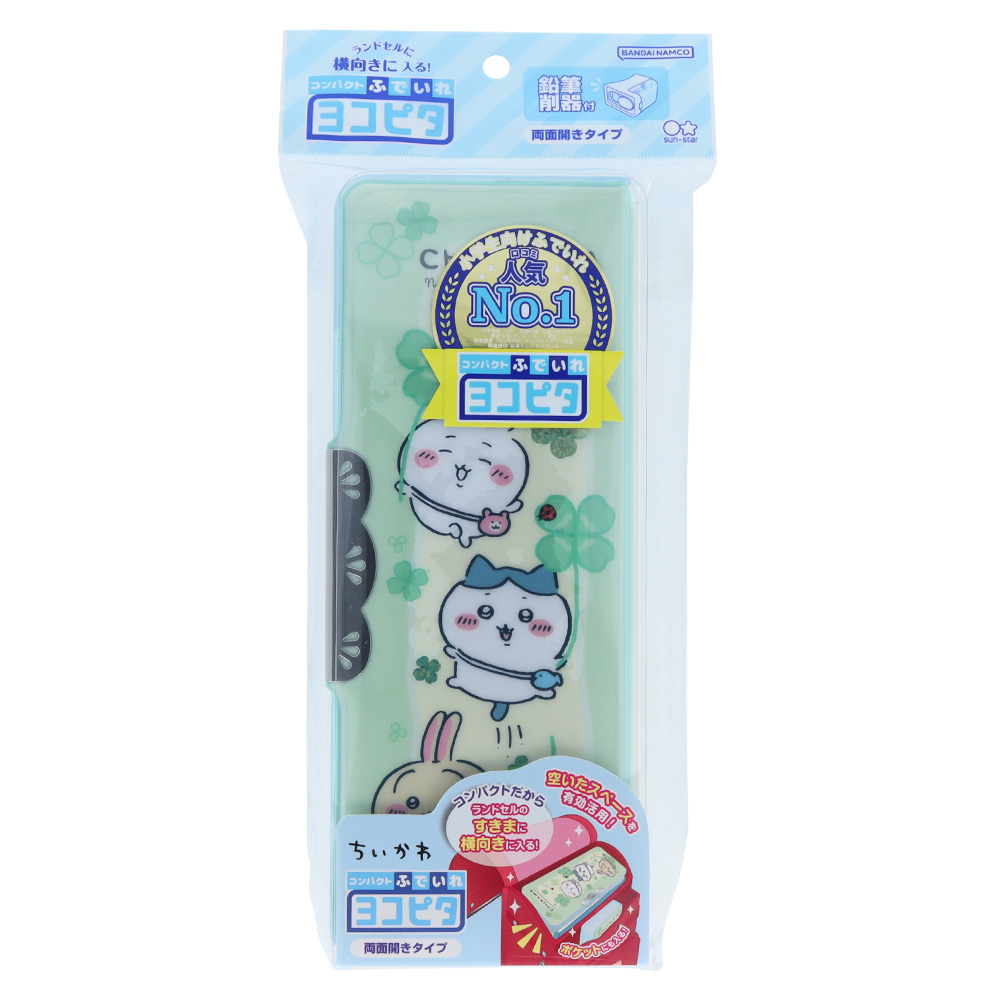 ポシェットを持った「ちいかわ」「ハチワレ」「うさぎ」が四つ葉のクローバーを手に持った、かわいいデザインの筆箱です。