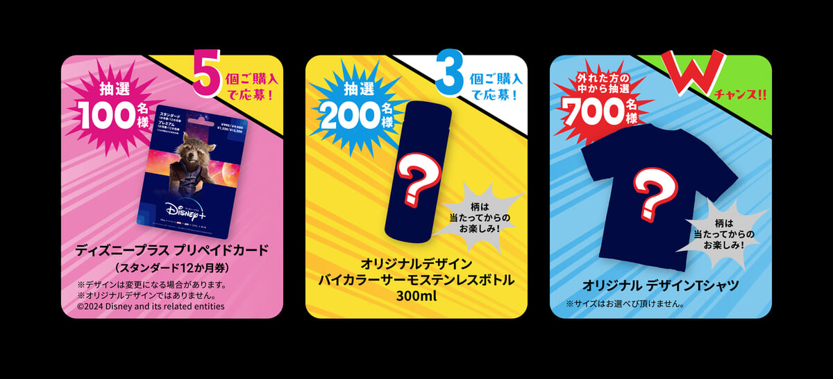 5個購入で応募できるコースには「ディズニープラス」のプリペイドカードスタンダード12か月分、3個購入できるコースは、オリジナルデザインのステンレスボトルが用意されています。