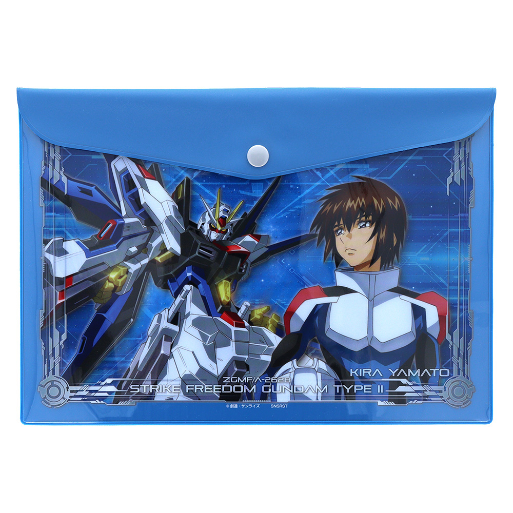 ブルーを基調にした背景に「キラ・ヤマト」と「ストライクフリーダムガンダム弐式」を描いたクリアファイル。