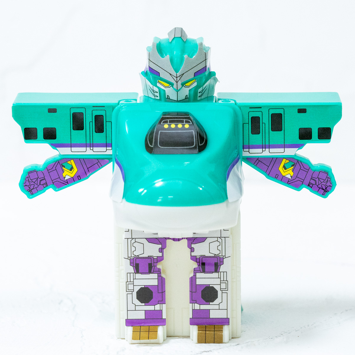 新幹線H5系はやぶさから脚・腕・頭からパーツを引き出すと、シンカリオンモードの「シンカリオン H5はやぶさ」に変形。