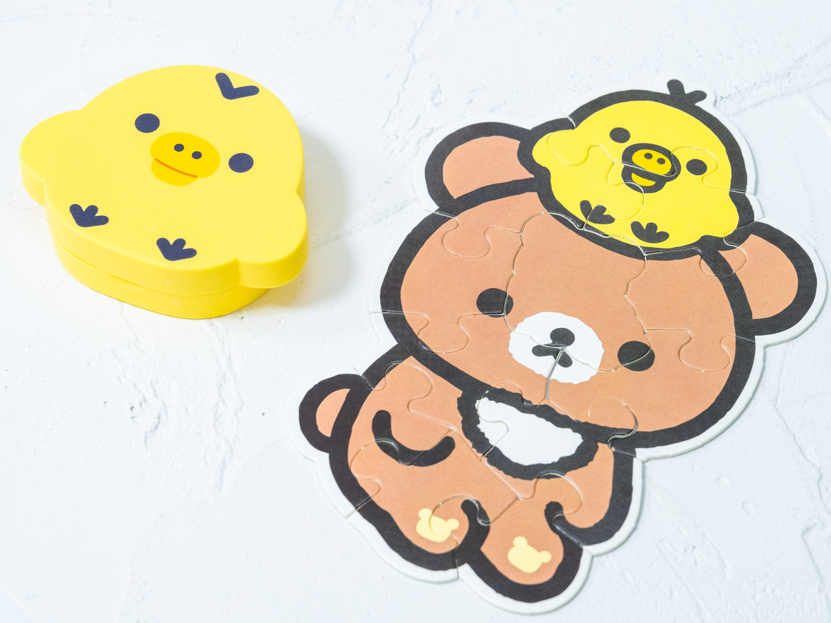 キャラクターのフェイス型ケースに「リラックマ」や「コリラックマ」、「キイロイトリ」と「チャイロイコグマ」を完成させる両面パズルが入っています。