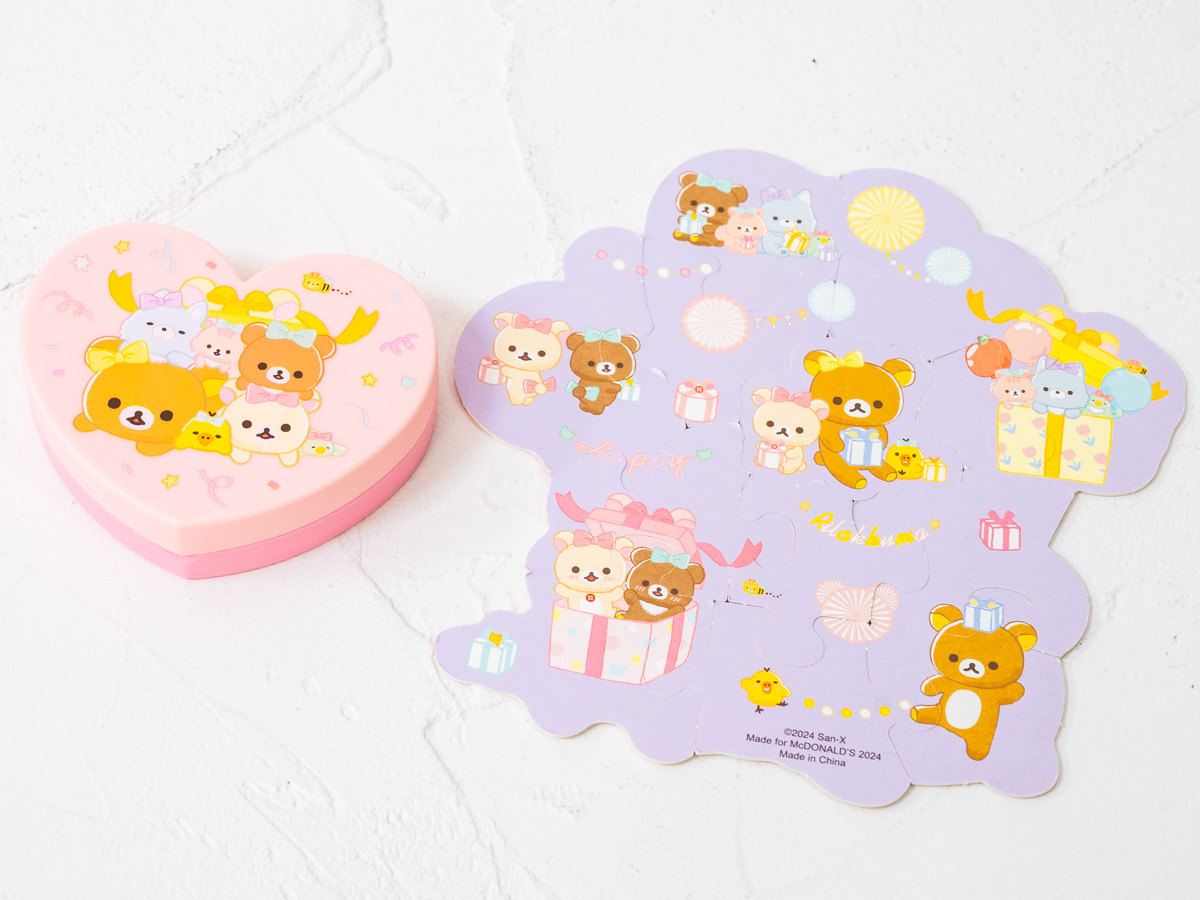 2024年5月24日から登場するハッピーセット「リラックマ」第2弾は、ハートや星形のケースに入った両面パズル。
