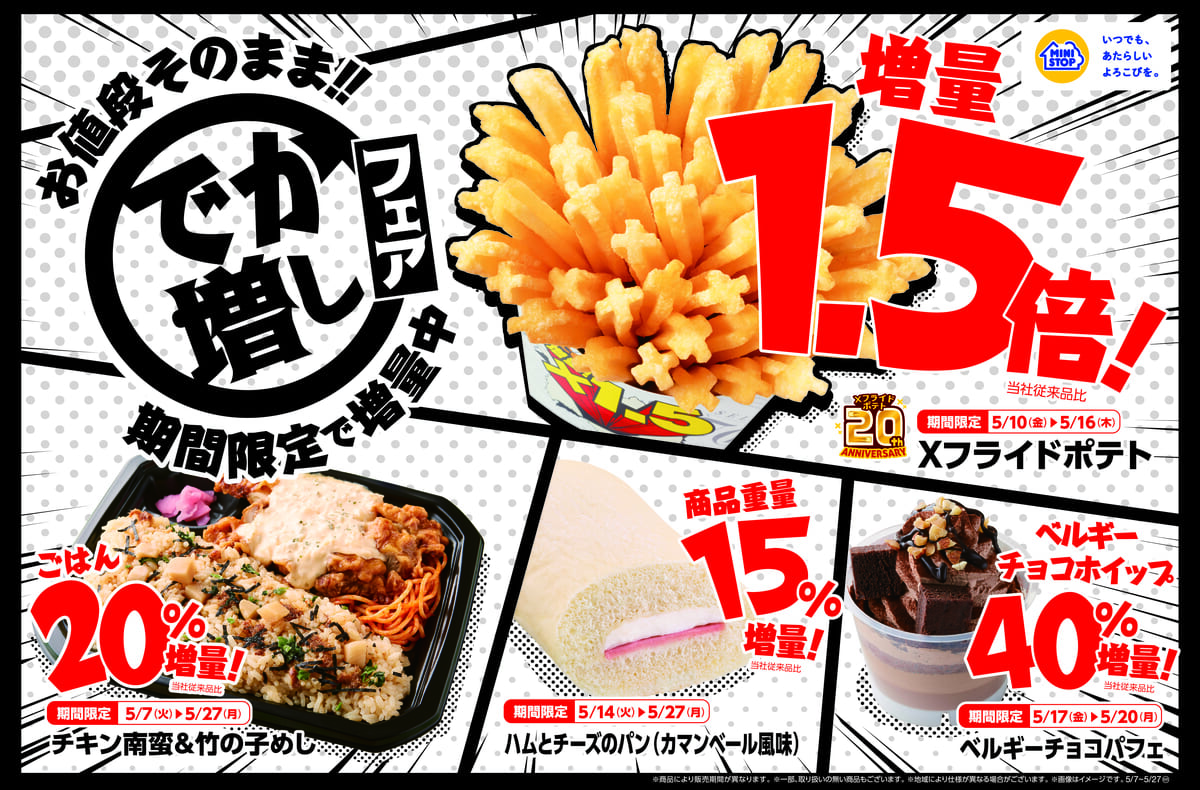 値段はそのままで増量中した商品が楽しめるお得な「でか増しフェア」は全国のミニストップで2024年5月7日(火)より開催です。