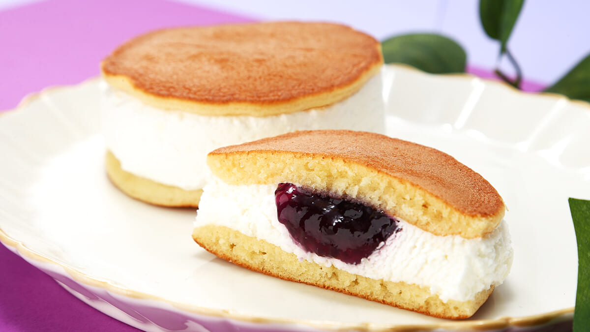 レアチーズ風味のホイップクリームとブルーベリージャムをサンドした爽やかな風味のもちもちの生どら焼きです。