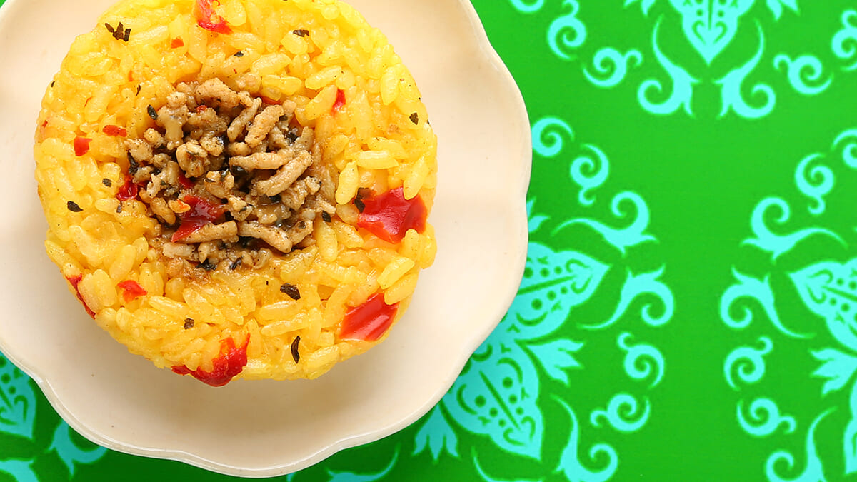 鶏ひき肉と野菜のバジル炒めに卵黄ソースを加え、イエローライスにトッピングしたおにぎりです。
