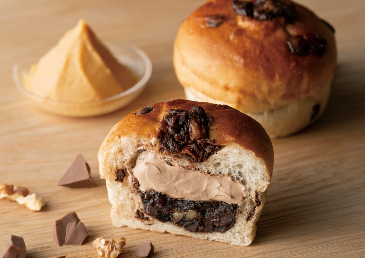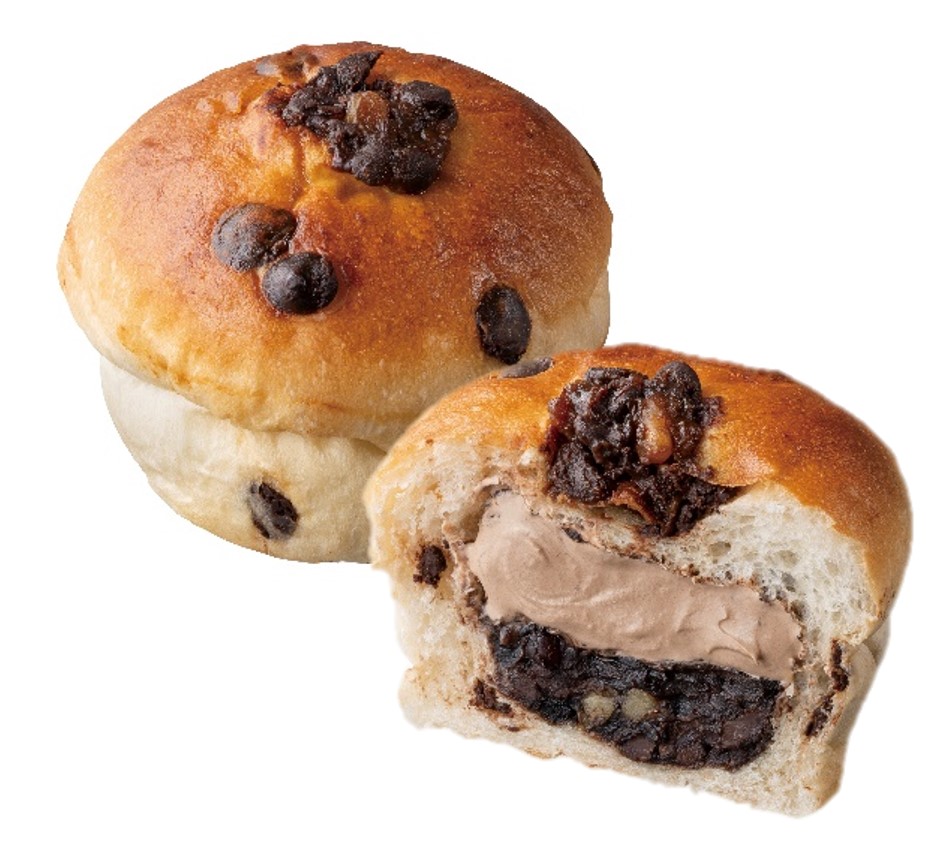 「あんみそショコラぱん 3個入」はチョコレート、つぶあん、味噌だれとくるみの食感や味わいの異なる素材を使用し、チョコレートチップを練りこんだ柔らかい生地で焼きあげたパンです。