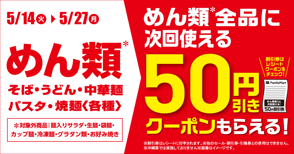 対象のめん類を買うと次回購入時に、対象のめん類全品が50円引き50 円引きになるクーポンレシートが貰えるキャンペーンです。
