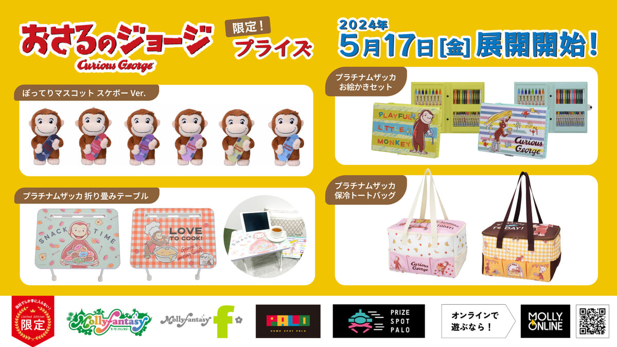 イオンファンタジーが運営する「モーリーファンタジー」「PALO」施設に、「おさるのジョージ」のプライズグッズが2024年5月17日(金)より登場!