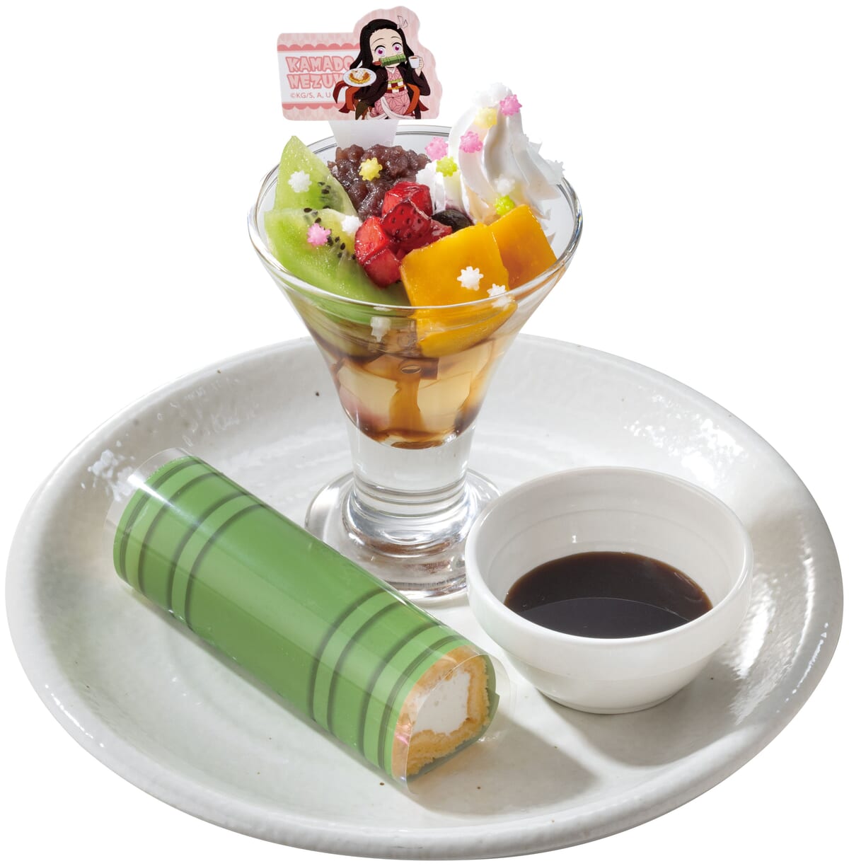 「竈門禰豆子」が口にくわえている”竹筒”をイメージしたロールケーキとあんみつをのせたデザートプレート。