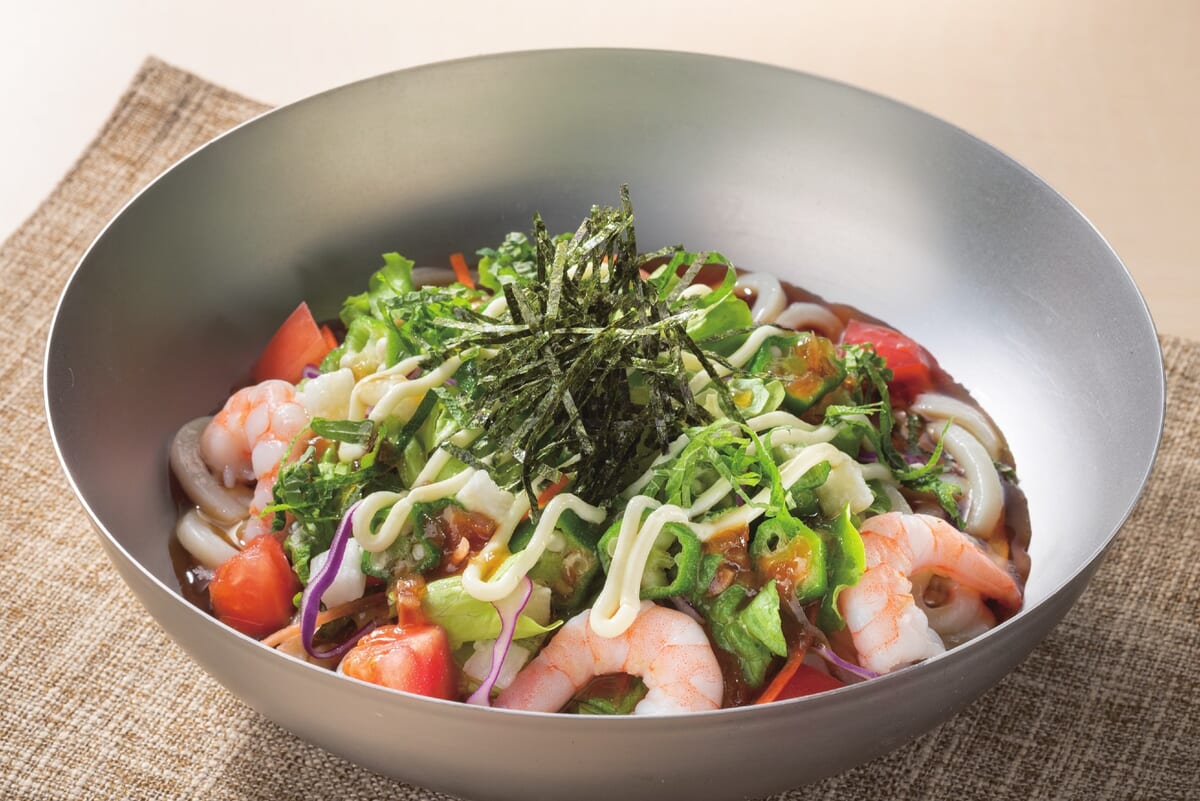 「鬼滅の刃」のオリジナルクリアファイルがもらえる対象メニューとして、ヘルシーな「ねばとろサラダうどん」(価格:950円(税込))と、