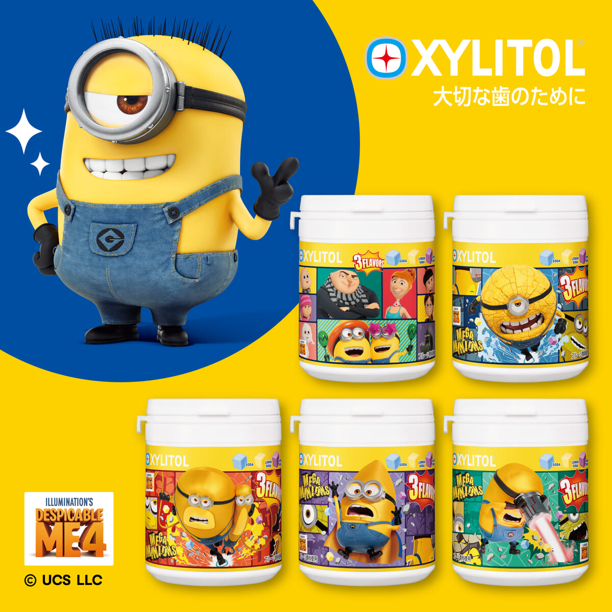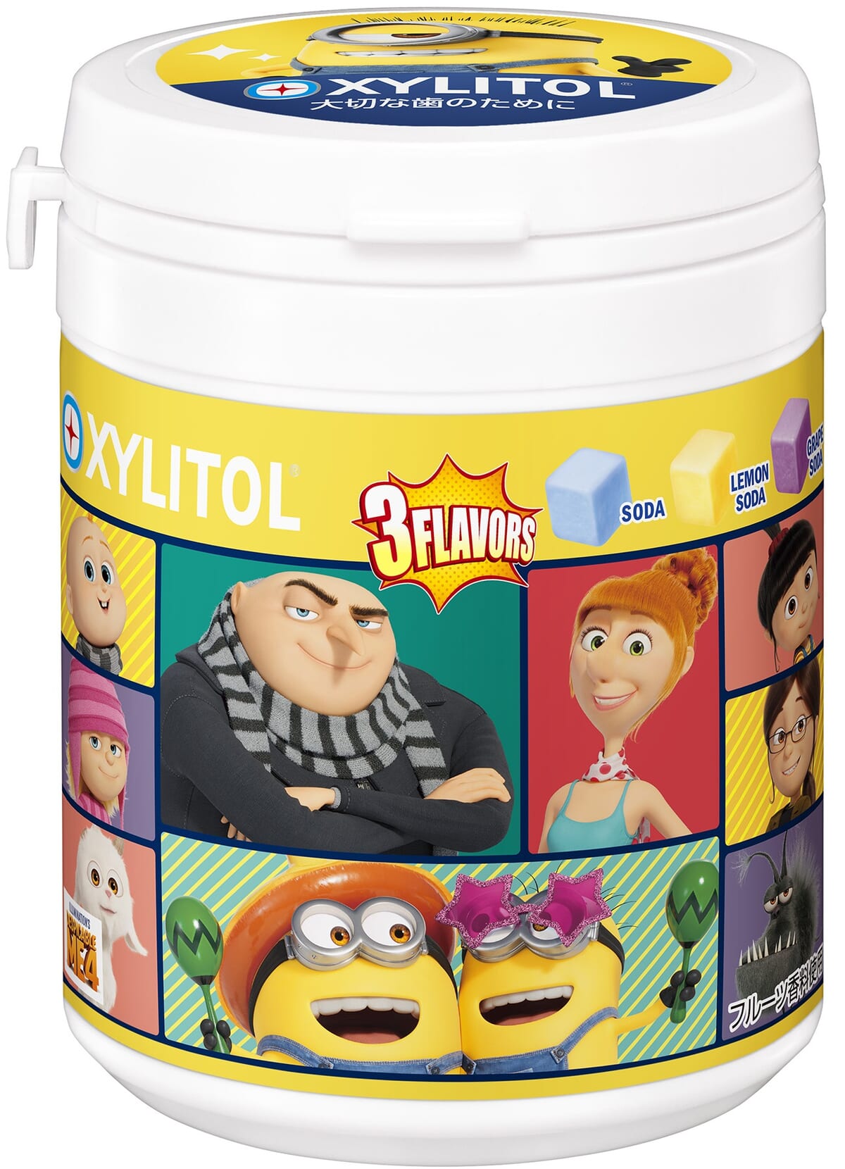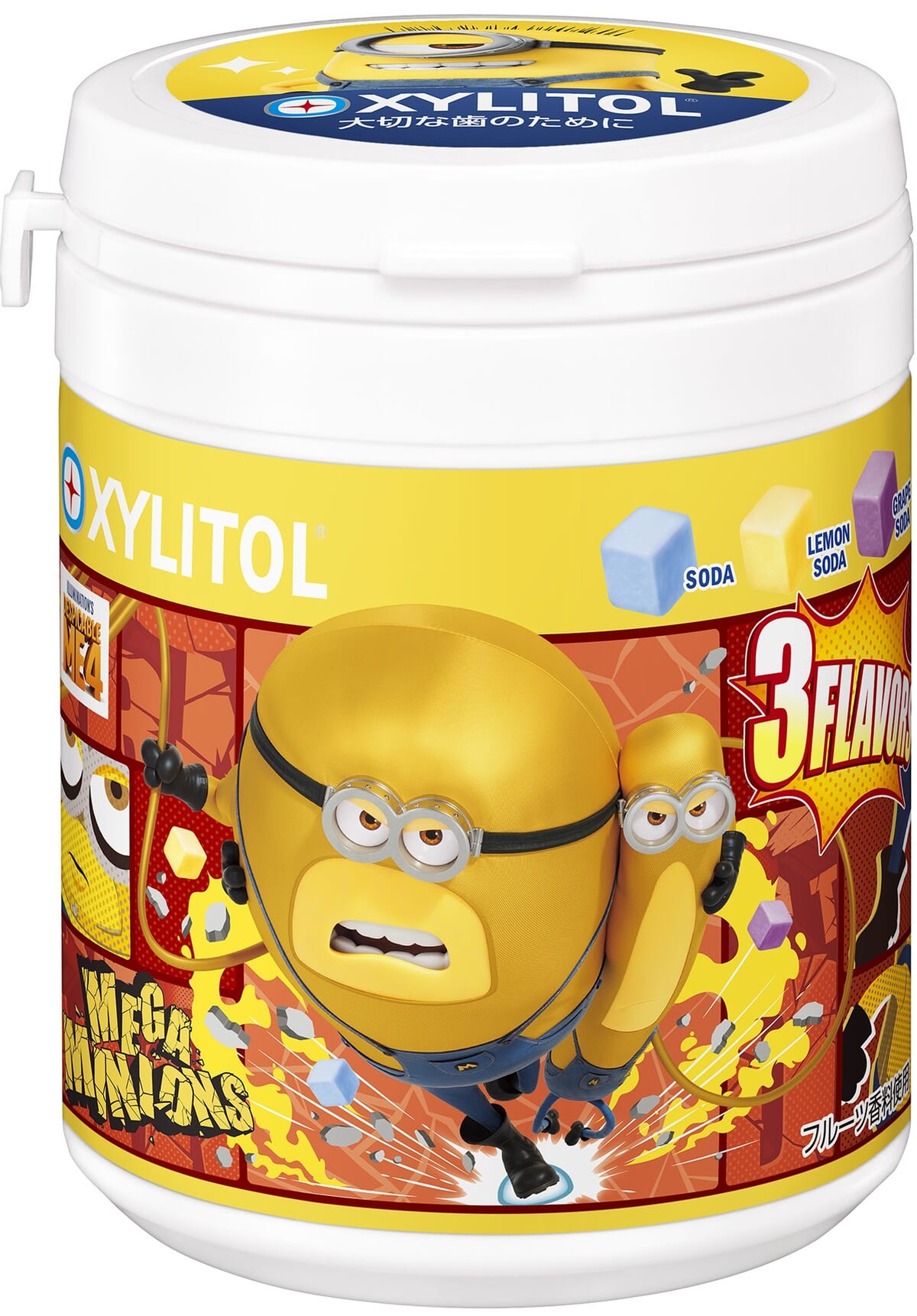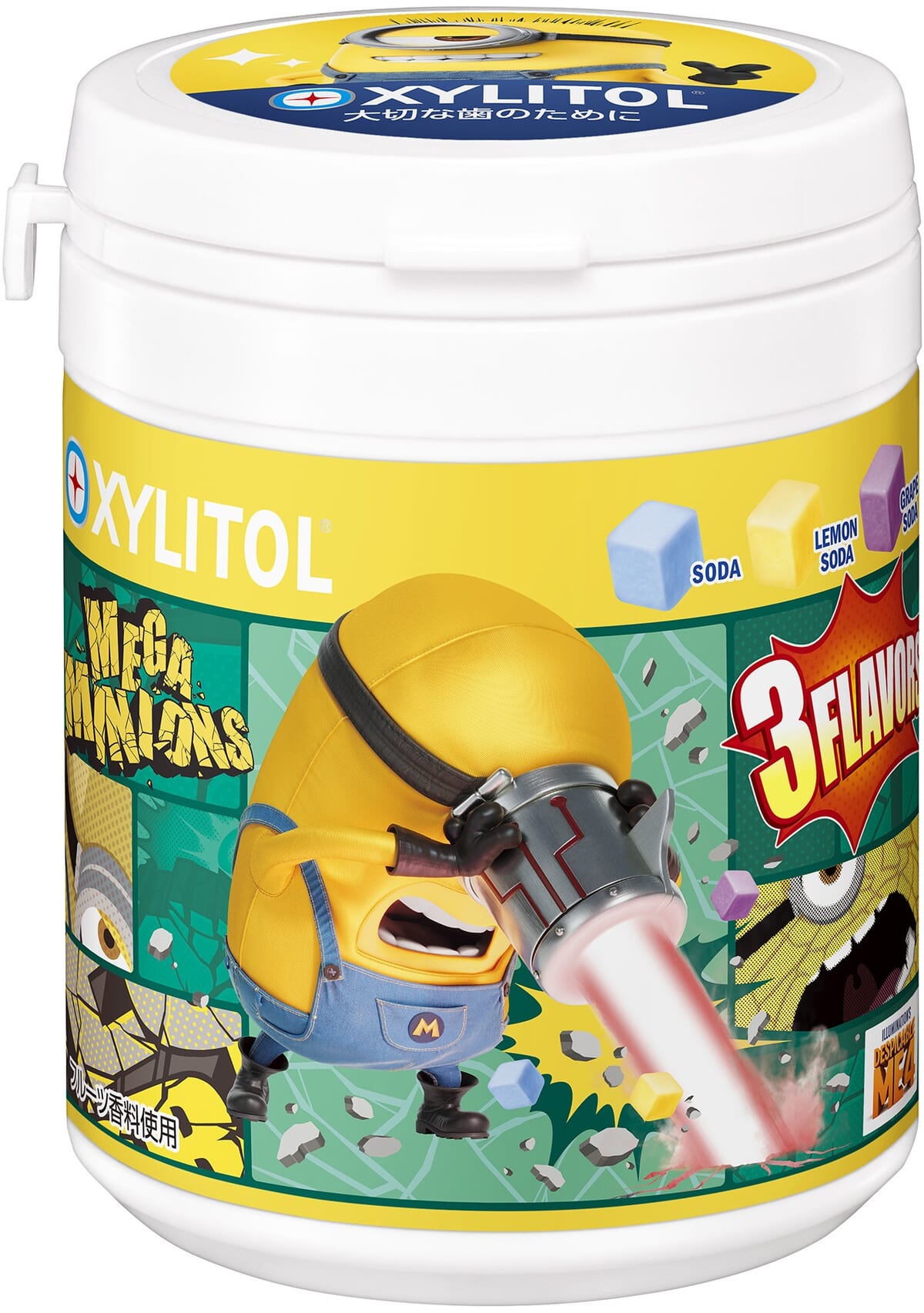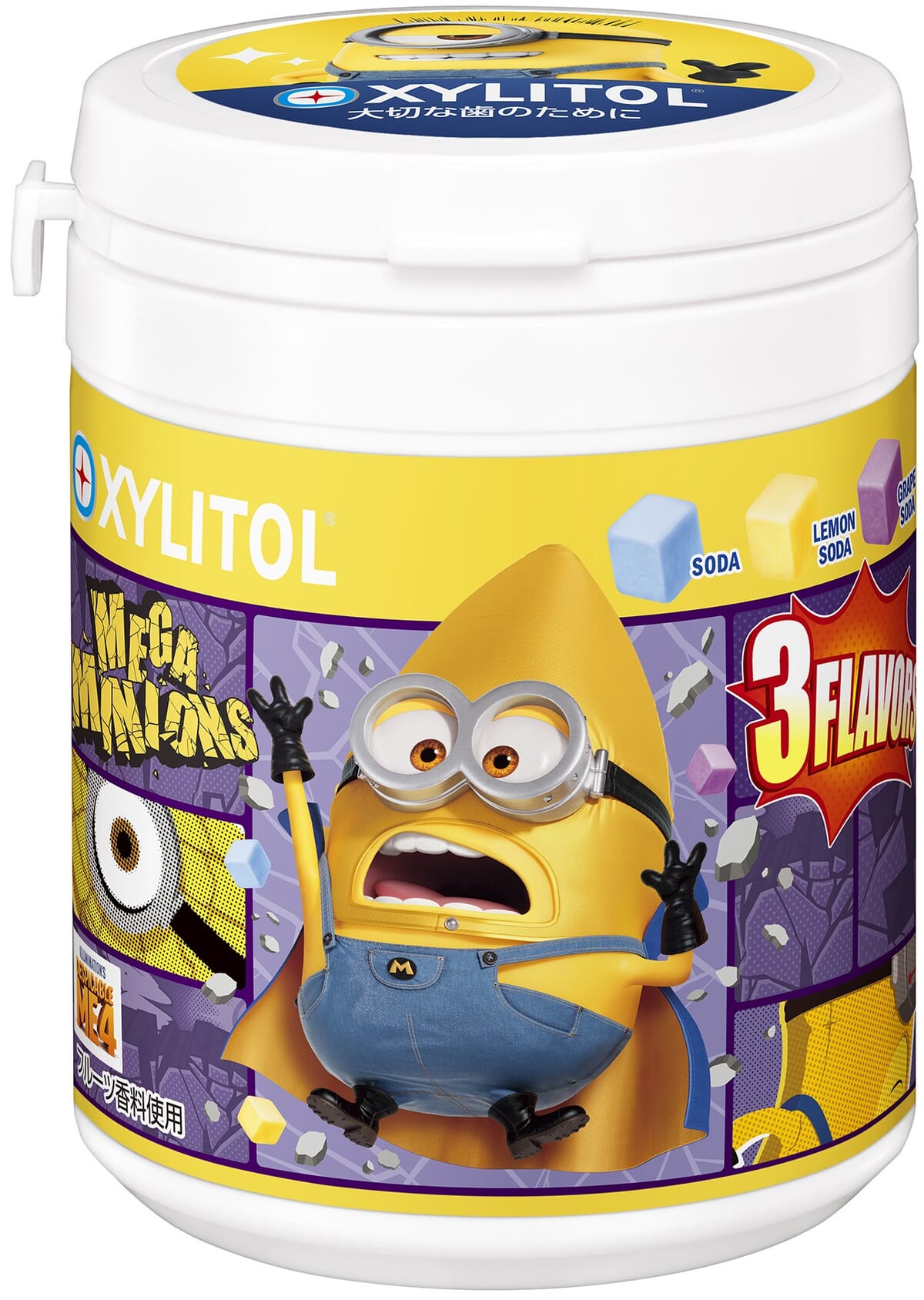アニメ映画『怪盗グルーのミニオン超変身』の公開に先駆けて、「キシリトールガム ENJOY CUBEアソートボトル」ミニオンデザインが登場!