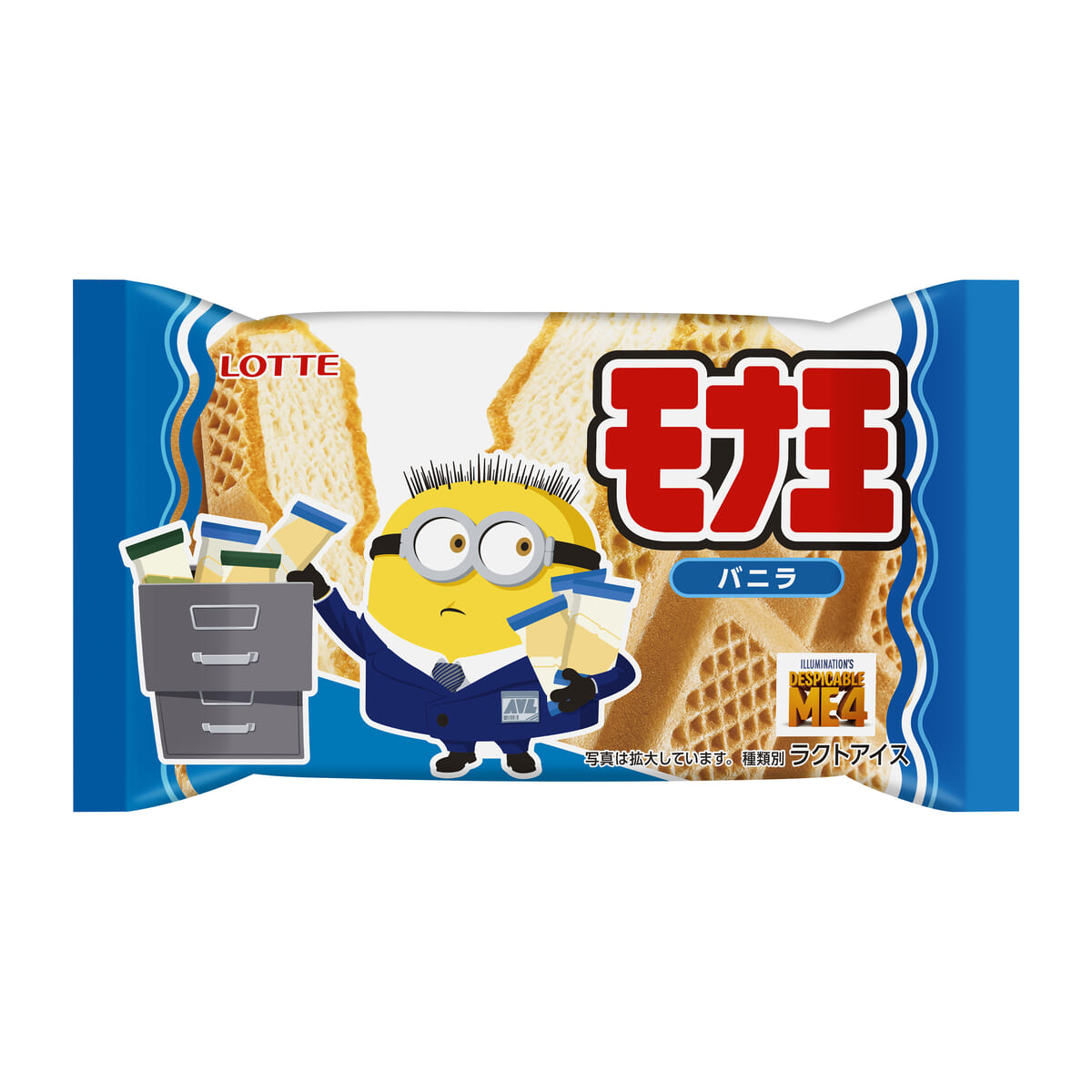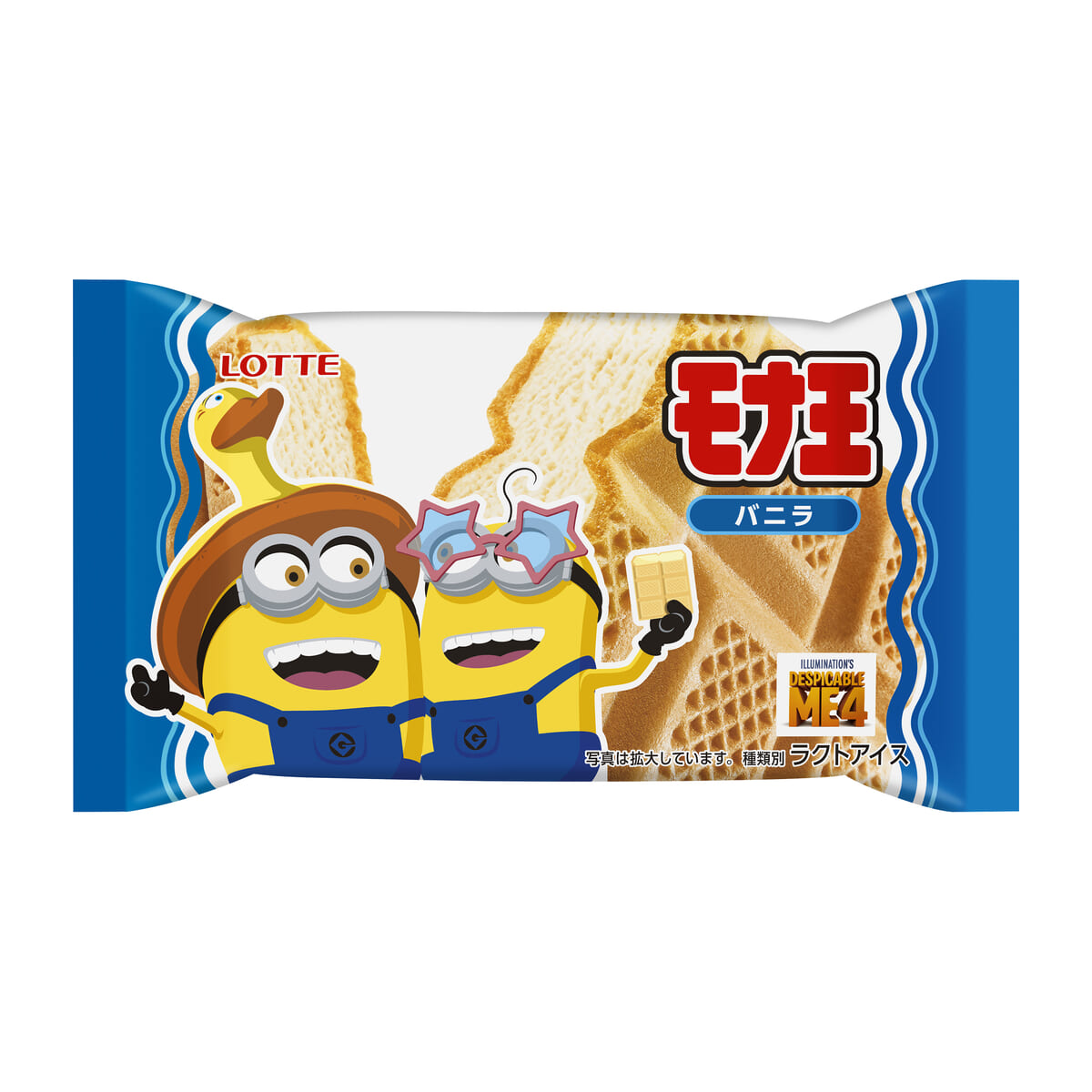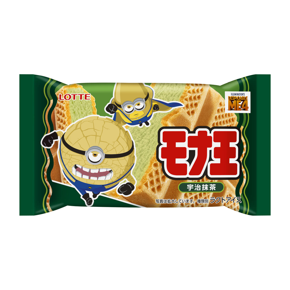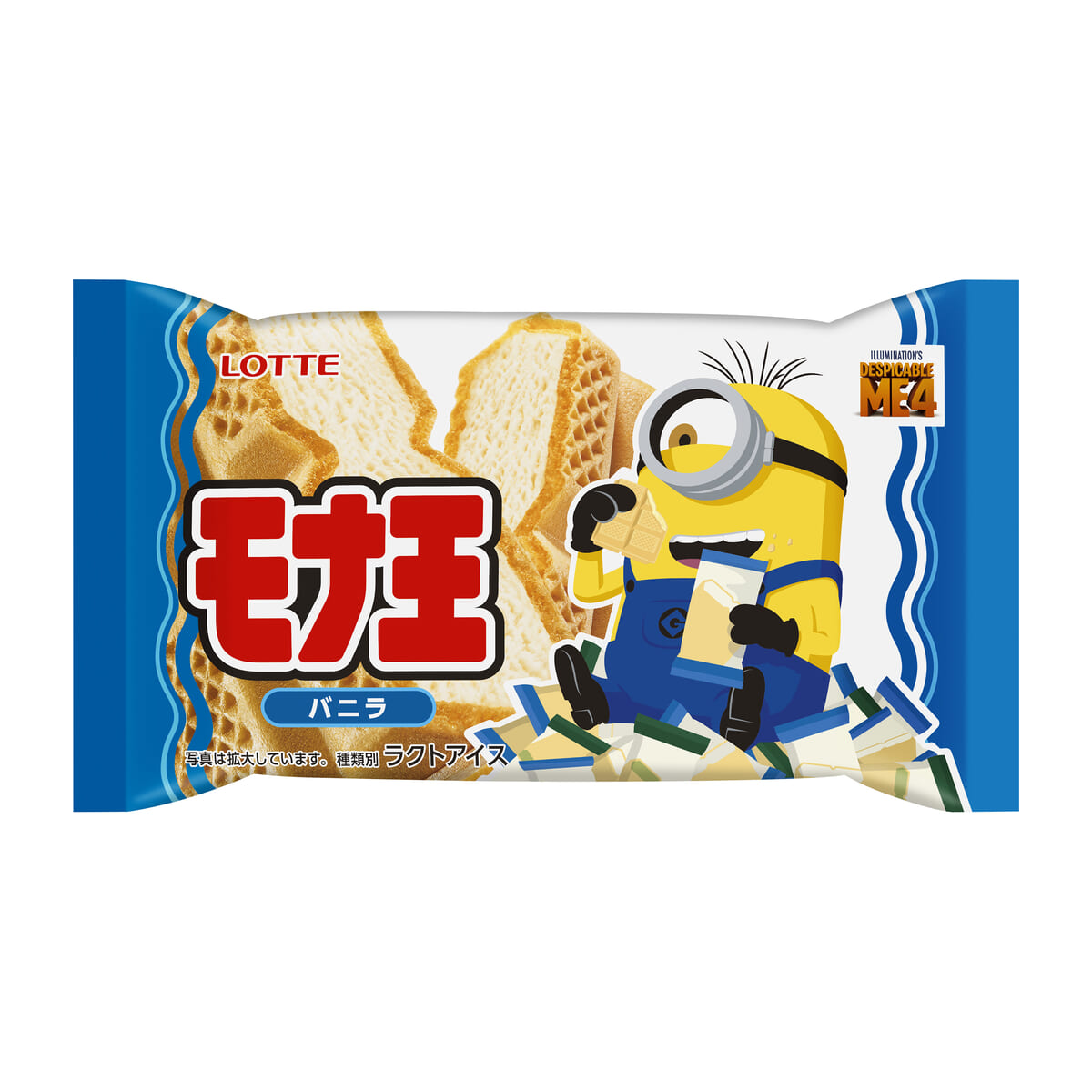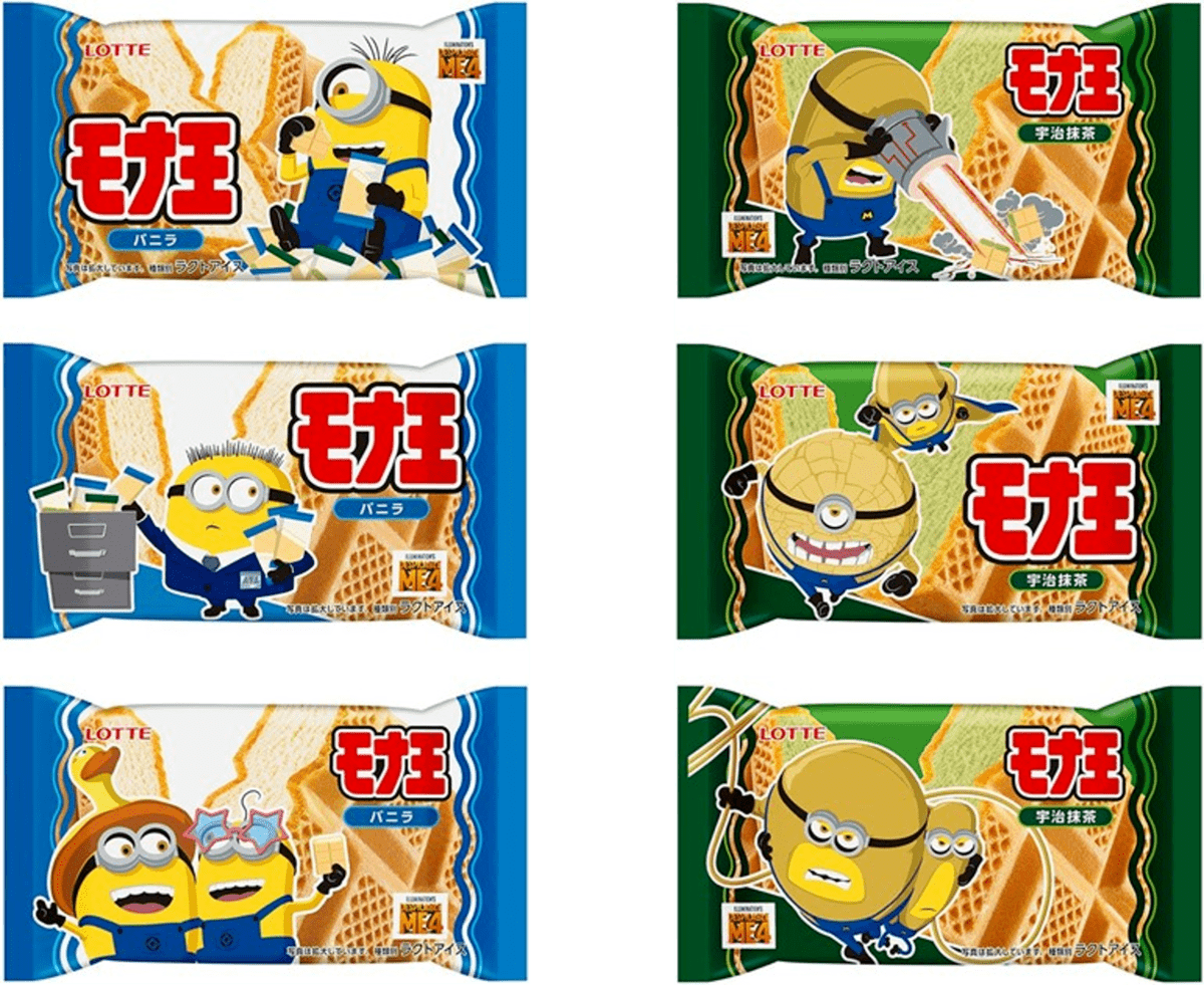 また2024年6月中旬からは、ロッテのモナカアイス「モナ王」ブランドより、ミニオンデザインの「モナ王 バニラ/宇治抹茶」第2弾が販売されます。