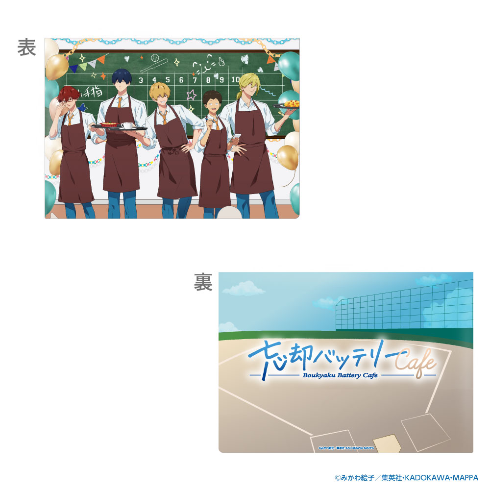 野球場を描いた裏面には「忘却バッテリーカフェ」のロゴがプリントされています。