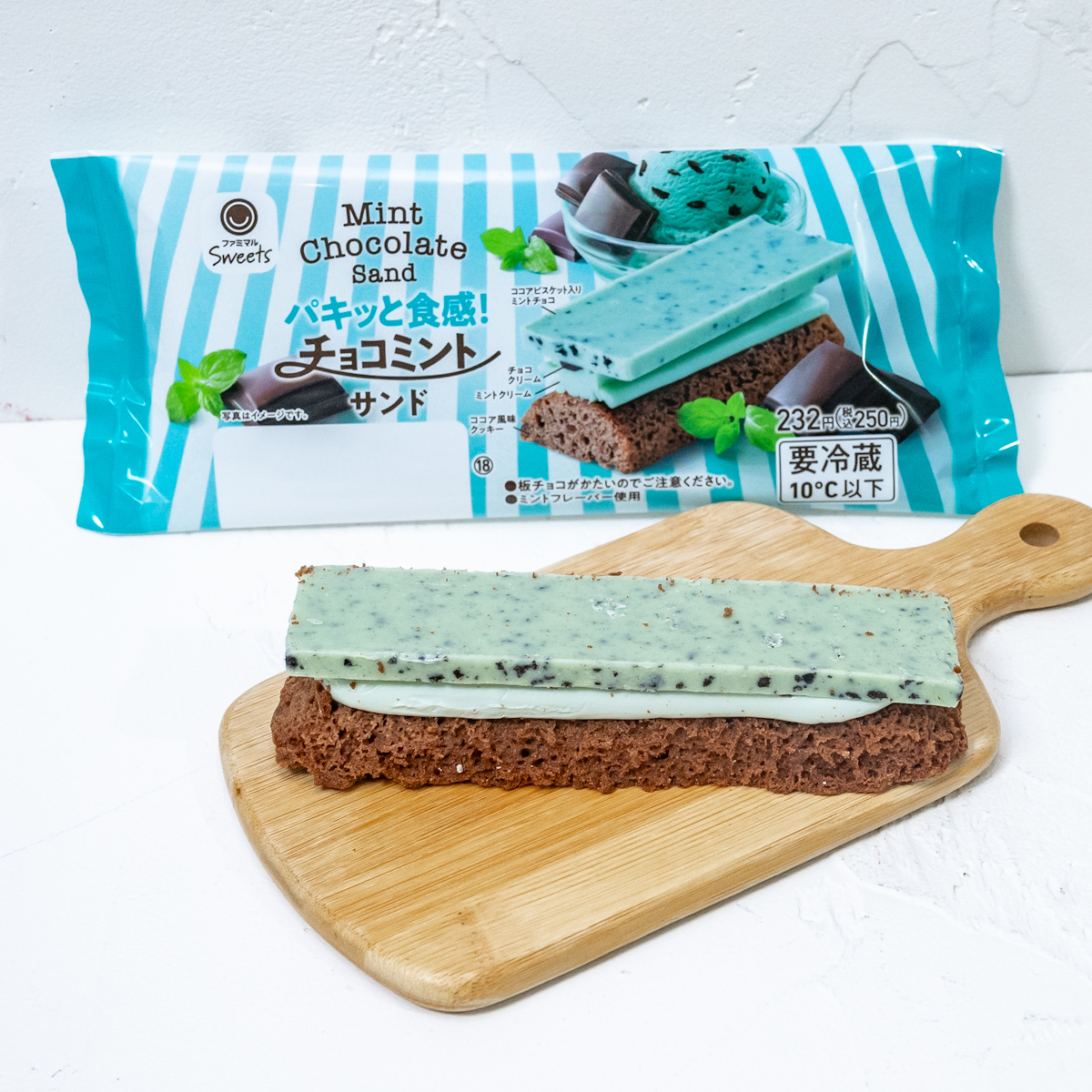 ミントチョコとココア風味クッキーの間にミントクリームとチョコクリームを挟んだ満足サンド。