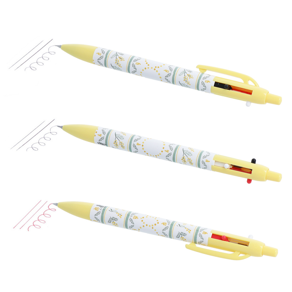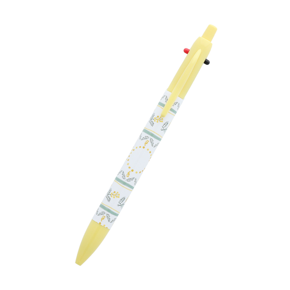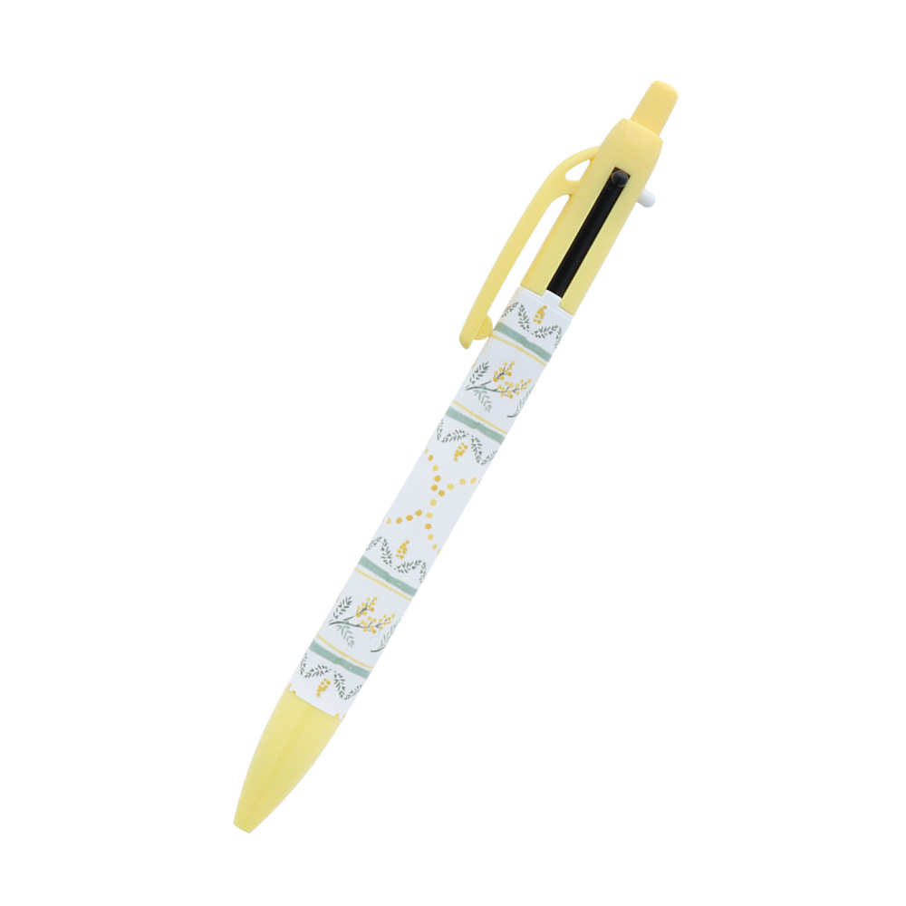 イエローの本体にミモザの花モチーフをあしらった多機能ボールペン。