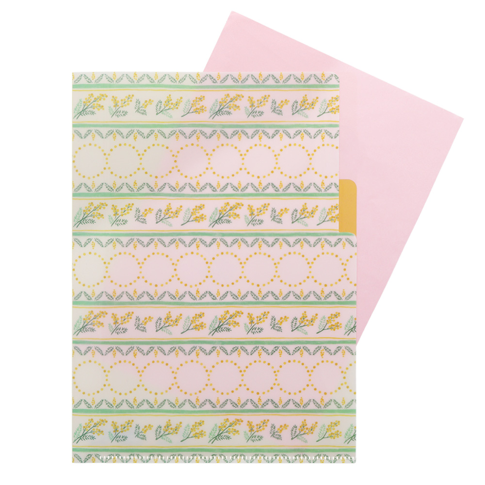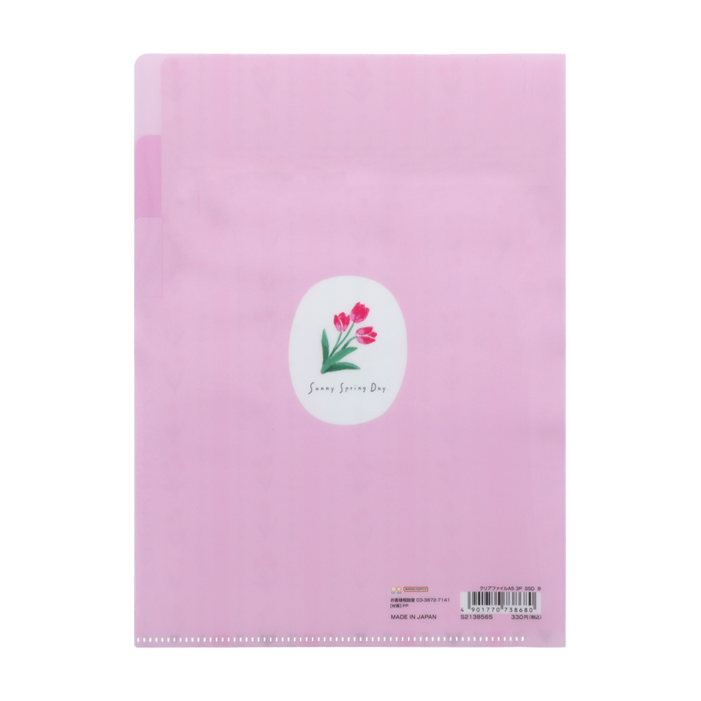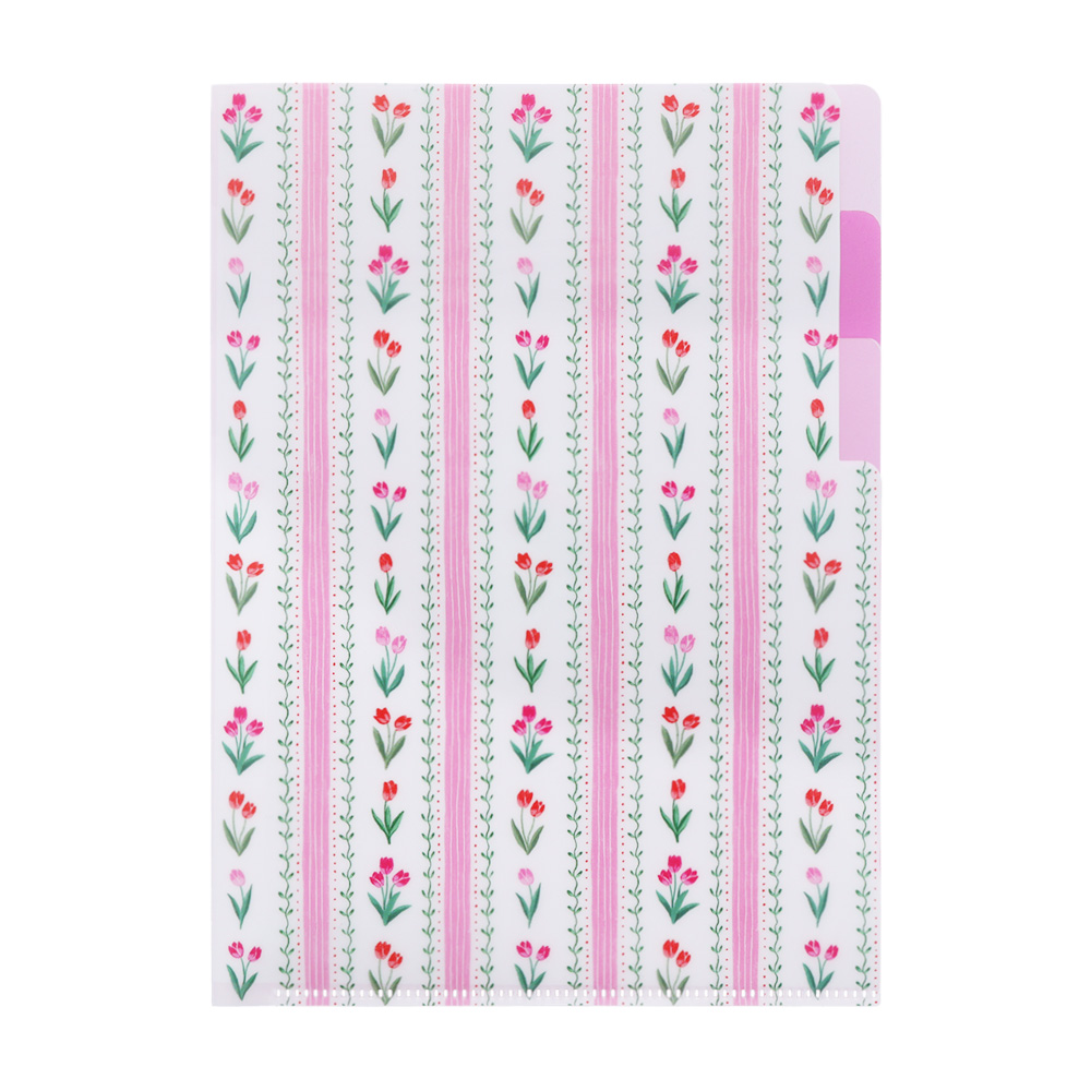 チューリップの花とピンクのストライプ、濃淡で分けた仕切りがオシャレなクリアファイル。