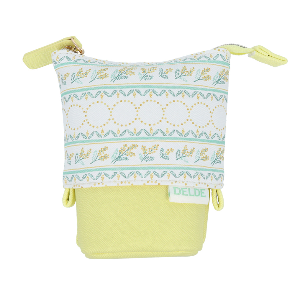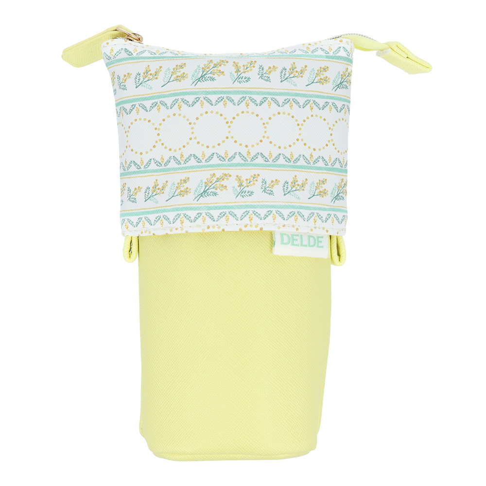 ミモザの花をあしらった上部をスライドさせるとペンスタンドにもなるペンケース。