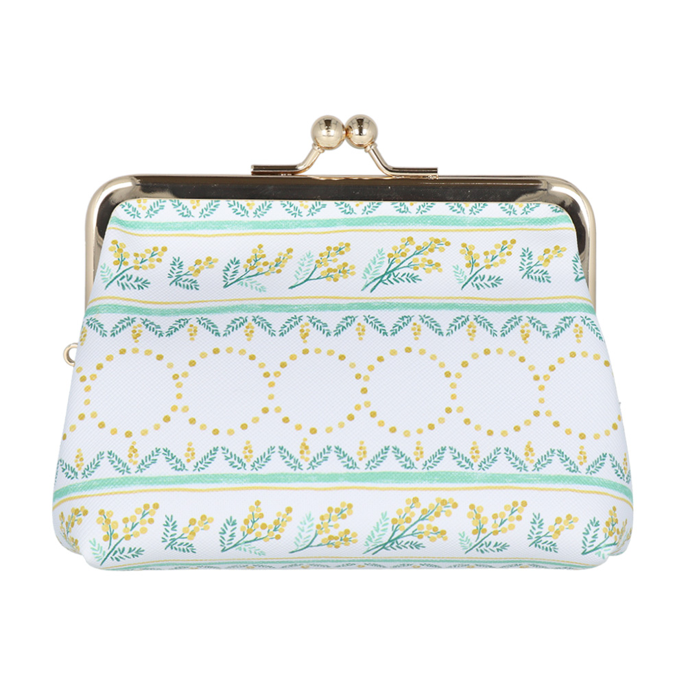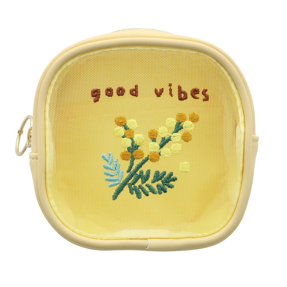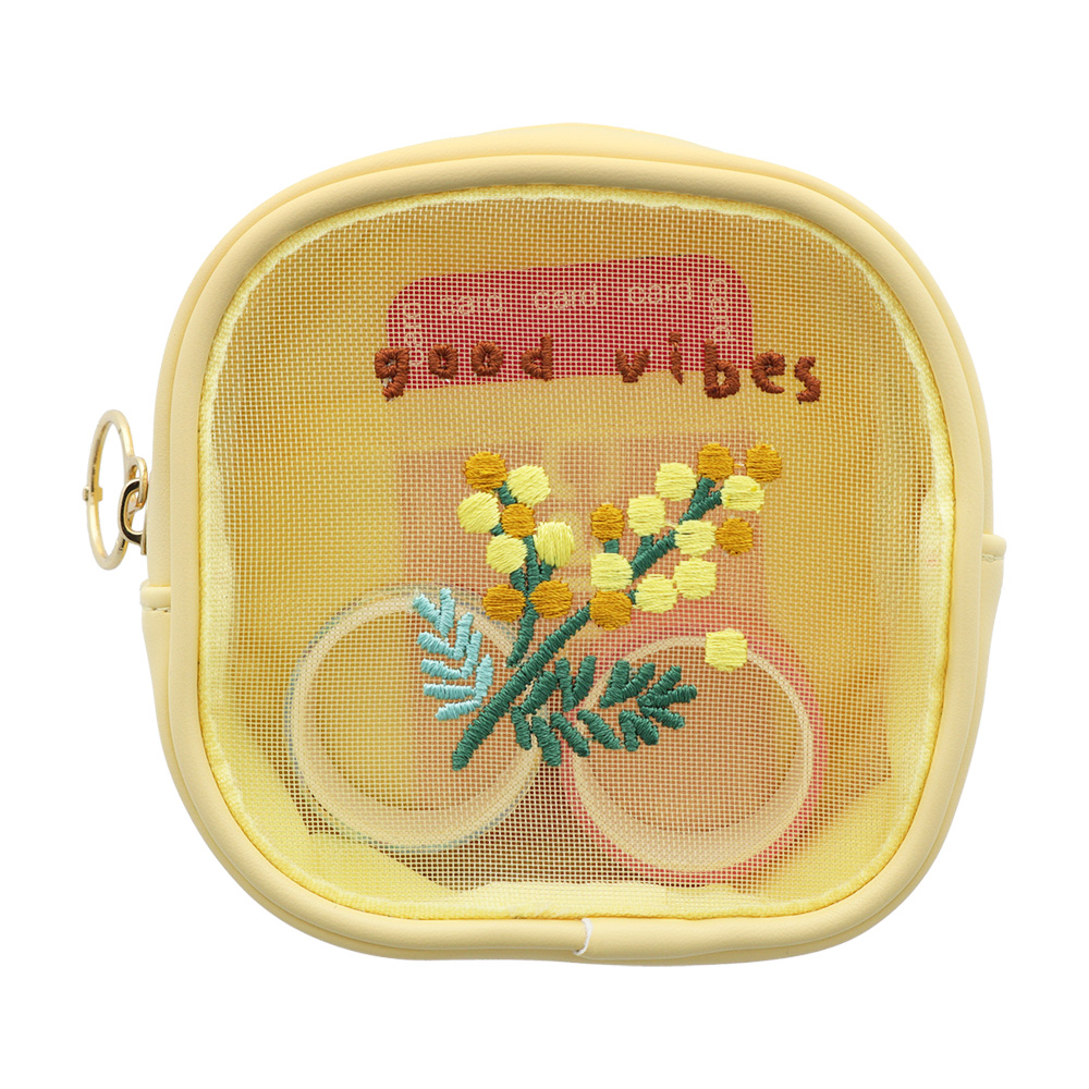 イエローのポーチに、ミモザの花を刺繍したデザイン。