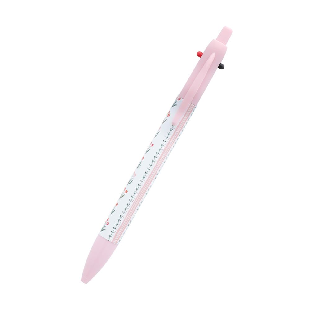 ピンクの本体にチューリップのモチーフがかわいい多機能ボールペン。