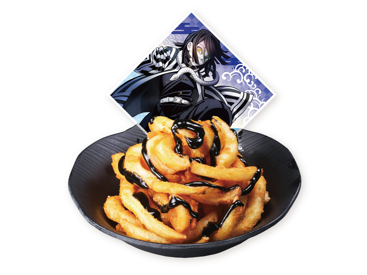 カールしたフライドポテトで「伊黒小芭内」の、とぐろを巻く”蛇柱”を表現した「伊黒小芭内の渦巻きポテト」