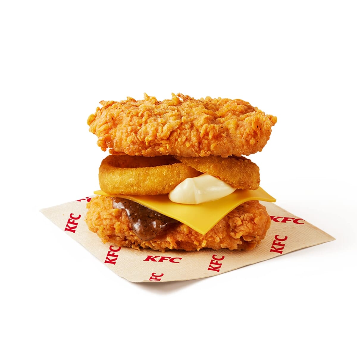 骨なしケンタッキーにオニオンリングを挟み込んだ、ボリューム満点の「ガーリックソースのオニオンフィレバーガー」