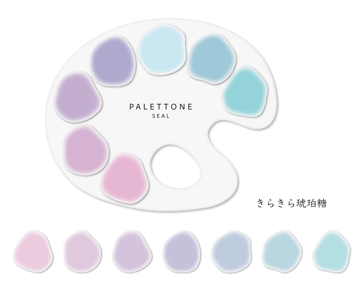まるで宝石のような色合いで人気のお菓子・琥珀糖をイメージしたパレット風シールです。