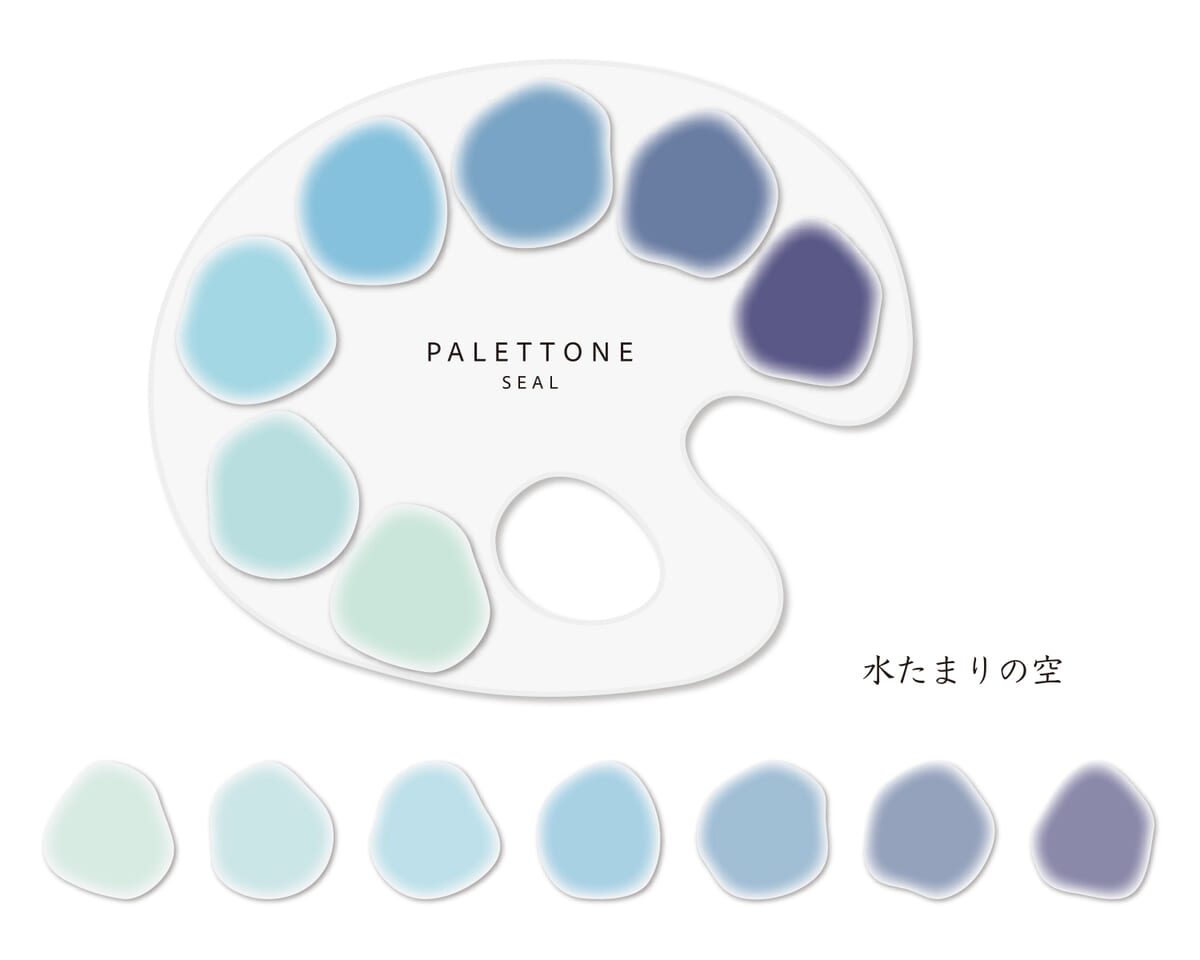 きれいなブルーが集まる「水たまりの空」のパレット風シール。