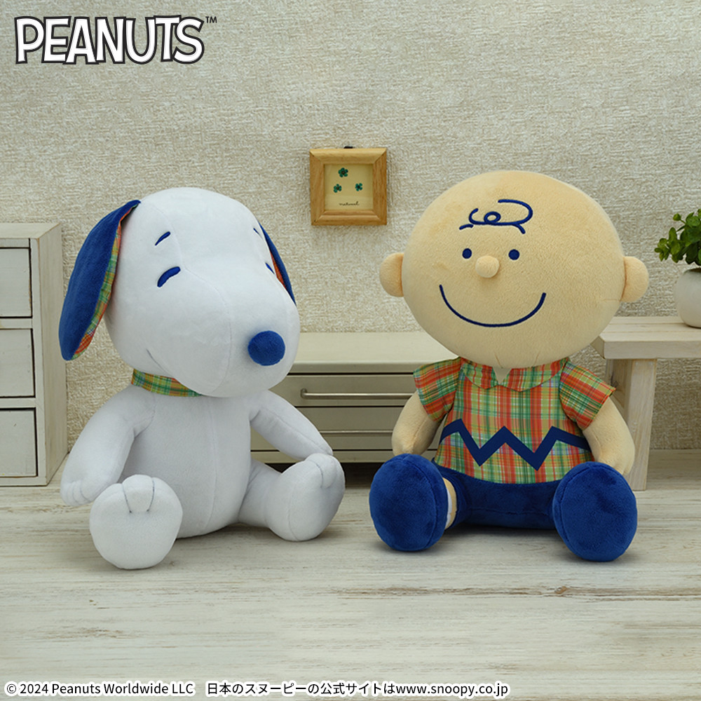 「スヌーピー」の耳や「チャーリー・ブラウン」のシャツに、爽やかなチェック柄の生地を使用したぬいぐるみ。