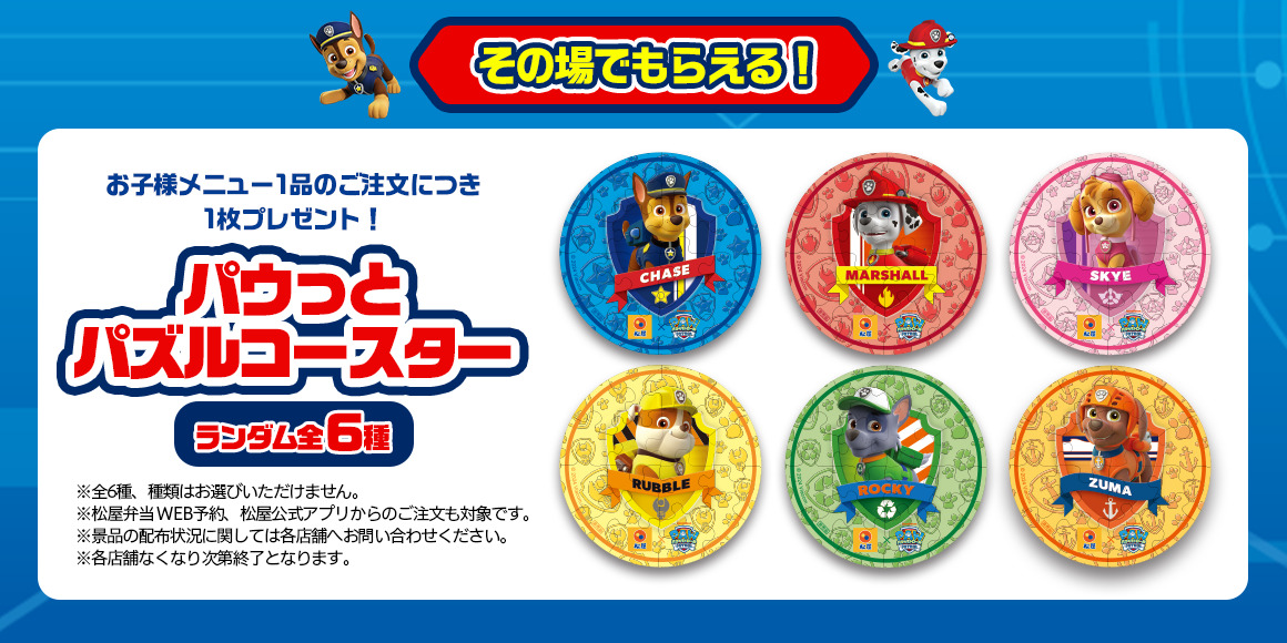 「松屋×パウ・パトロール」コラボ企画第1弾、松屋オリジナルグッズ「パウっとパズルコースター」プレゼントは、全国の「松屋」店舗にて2024年6月4日(火)より開催です。