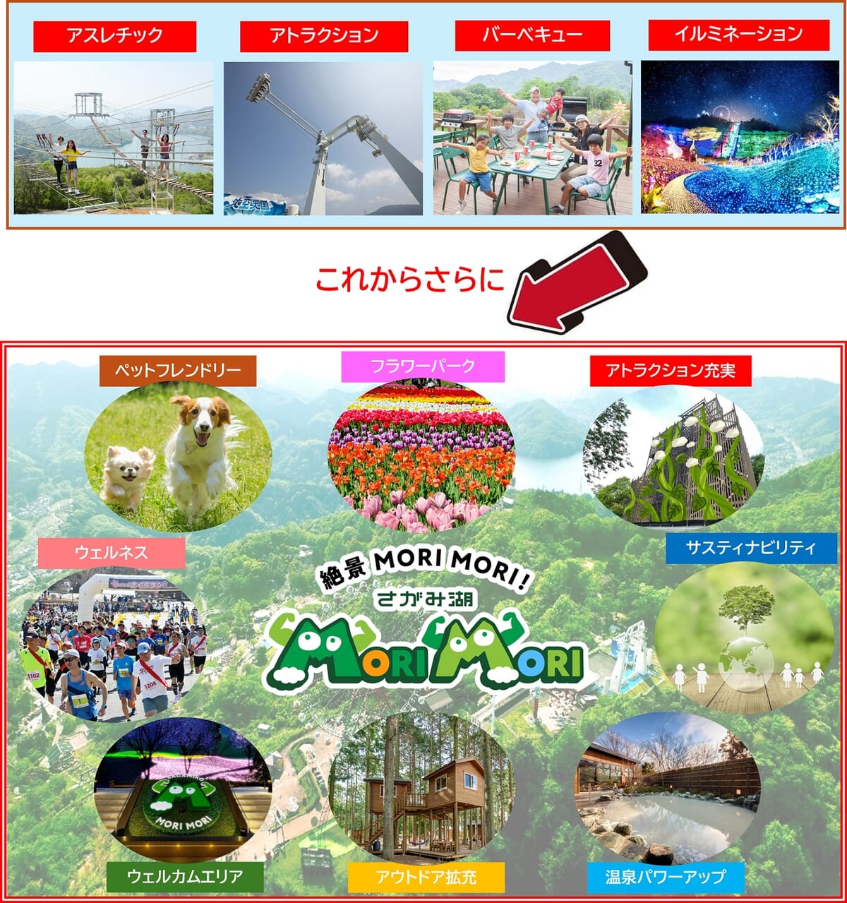 広大な相模湖の森に囲まれた環境で、今後も自然と調和し、訪れるすべての方々に感動的な体験を提供するレジャーパークへと進化を遂げることを目指し「さがみ湖MORI MORI(もりもり)」と改名。