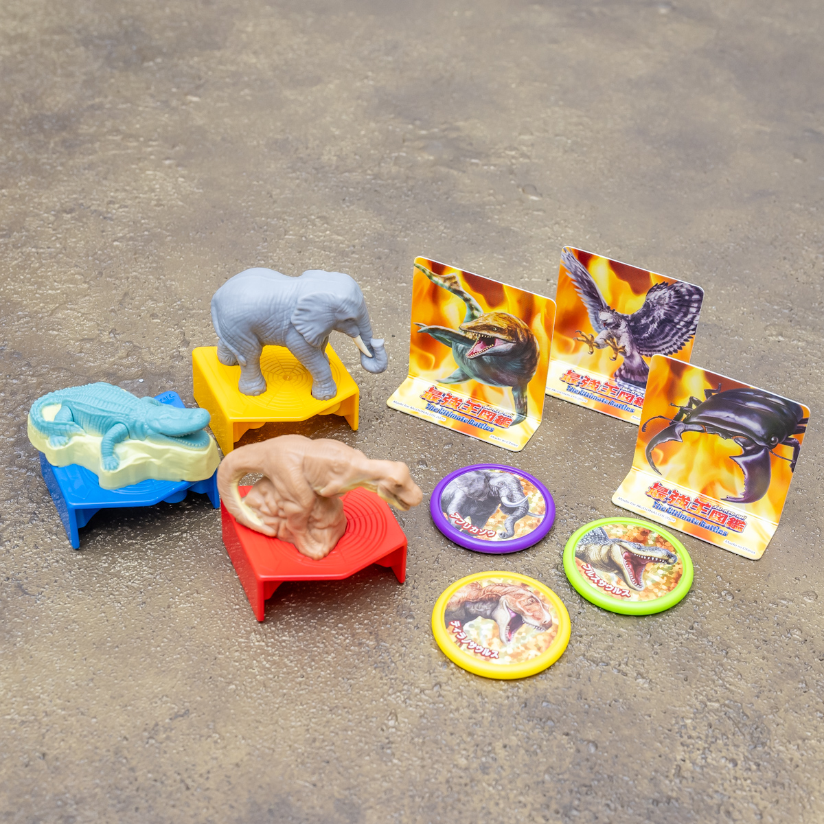 付属カードを対戦相手に見立てて遊べる、強い生物のフィギュアとディスクがセットのおもちゃ。