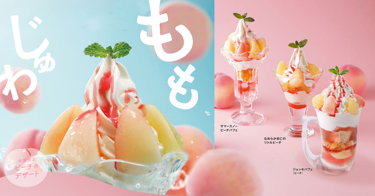 桃を贅沢に使用した「サマースノーピーチパフェ」「なめらか杏仁のリトルピーチ」「ジョッキパフェ(ピーチ)」が提供されます。