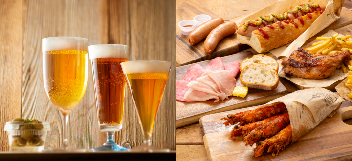 7種類の生ビールに加え、カクテルやソフトドリンク、肉料理やおつまみメニュー、